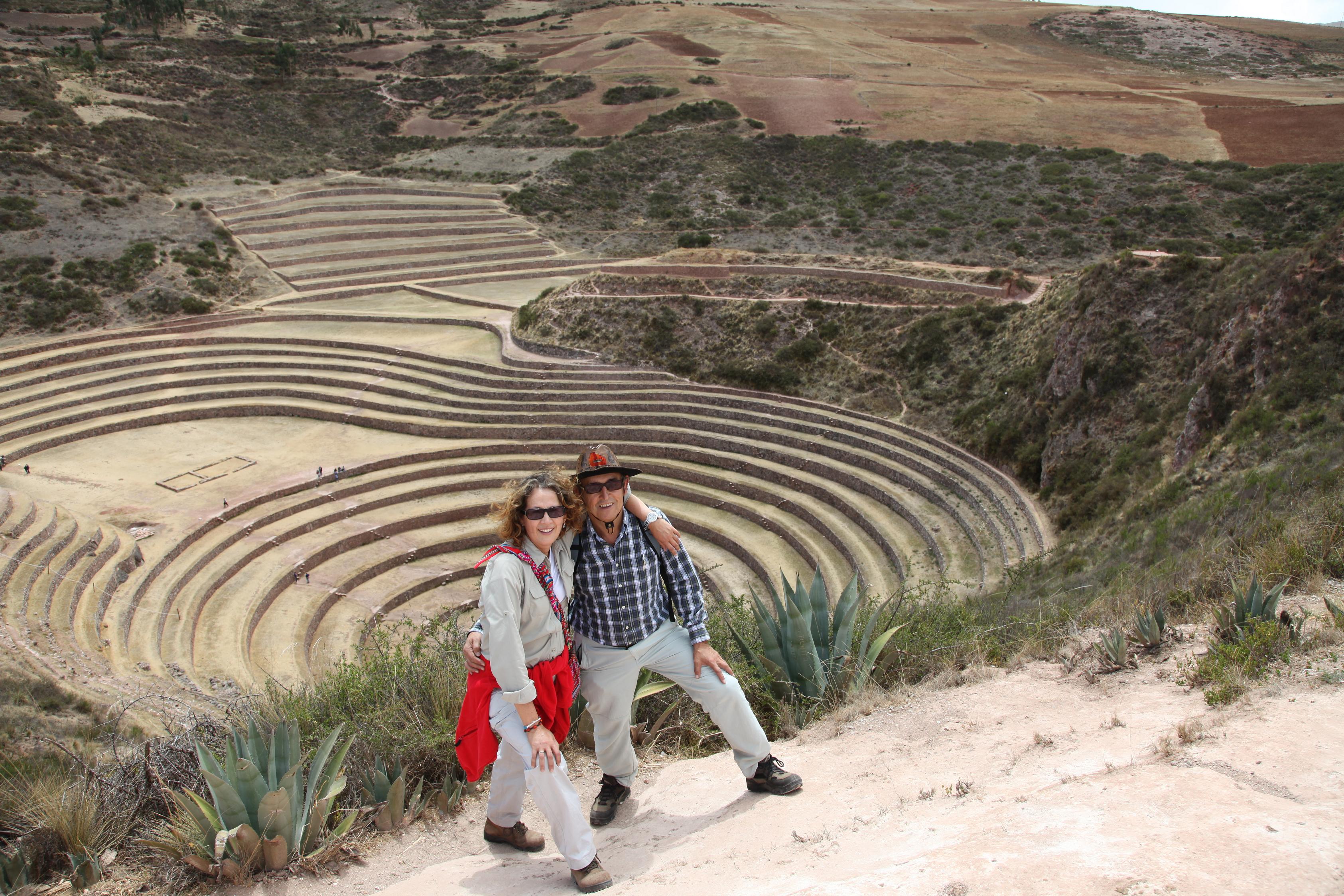 Efectivamente el sábado madrugamos y, de camino a los buses de Urubamba, fuimos visitando los mercados de artesanía aunque sin comprar para no ir cargados, dejando ese trabajo para el regreso por la tarde.  Nos ofertaron un taxi que iba bien de precio y lo sustituimos por el bus, para ir a Maras, desde donde partiríamos a ver Moray, un lugar que fue creado como centro experimental para cultivos (son diferentes bancadas o andenes, a diferente nivel de terreno, en los que comprobaban el tipo de cultivo que mejor se adaptaba a la altura, humedad, etc. Data de la época de los antiguos pobladores, y ahora se usa como atractivo turístico. Dicen que en la zona más baja se recarga energía para el cuerpo.  Lo que sí es cierto es que hace falta una buena dosis de energía para subir aquello después de haber llegado abajo del todo. Tras Moray nos fuimos a las Salineras, una zona de tiene creo que 380 pequeñas explotaciones de sal, a partir de un manantial que no se sabe bien de donde procede. Lo cierto es que hay muchas familias que viven de lo que les produce la sal que obtienen, además del atractivo turístico.  Nos gustó el recorrido, aunque nos dieron mal las explicaciones y descartamos ir en un tour organizado para evitar que nos anden llevando a lugares de compra… y nos salió mal el tiro porque al final pagamos más del doble haciéndolo en taxi.  Para colmo, en el mismo taxi me dí cuenta de que había perdido una cartera con dólares, euros, tarjetas de crédito, etc, que tuve que anular de inmediato.  En fin, que no todo va a salir a pedir de boca.