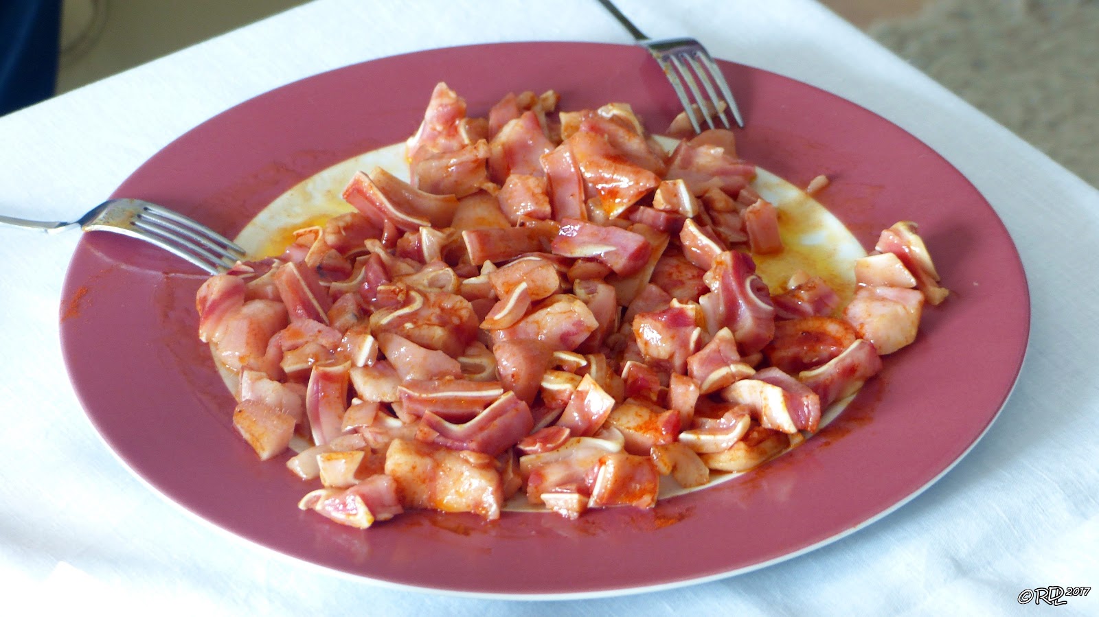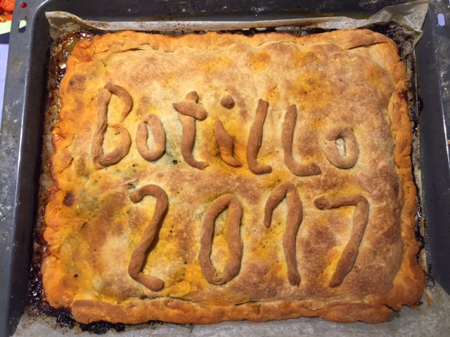 y Chicharrones aderezados con pimentón, sirvieron como introducción a la Empanada de Batallón característica y como «aperitivo» previo a la comida del botillo, adecuadamente acompañado de chorizos y de la rica verdura y patata que afortunadamente aligeran un poco la contundencia del plato fuerte.