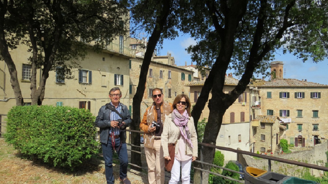 Ala mañana siguiente pudimos disfrutar, también con sol y temperatura aceptable, de las callejas y plazas de Volterra, localidad que yo no conocía de mi anterior viaje, y que me gustó. Pueblo bien cuidado, con mucho turista y facil de caminar ya que no hay excesivas cuestas ni desniveles. Y de Volterra, a San Gimignano a donde llegamos con la idea de ver el mercado en el cual, según las guias, se comercializa el azafrán, producto de la zona. Pero el mercado resultó ser un mercadillo ambulante que copaba las plazas principales de la localidad, con lo cual nos impedía ver los maravillosos edificios, plazas y callejas. Hubimos de conformarnos inicialmente con un pequeño recorrido por la zona más alejada del centro, y aprovechar para comer hasta que terminase la hora del mercadillo. Por suerte, el agua también aqui nos respetó y tras la comida pudimos verificar lo especial de este lugar, hacer fotos en cantidad y, como no, tomar un helado de los más nombrados en las guias en la «gelatería» más significada del lugar. Y como el destino final para esa jornada era Siena, antes de llegar alli hicimos una