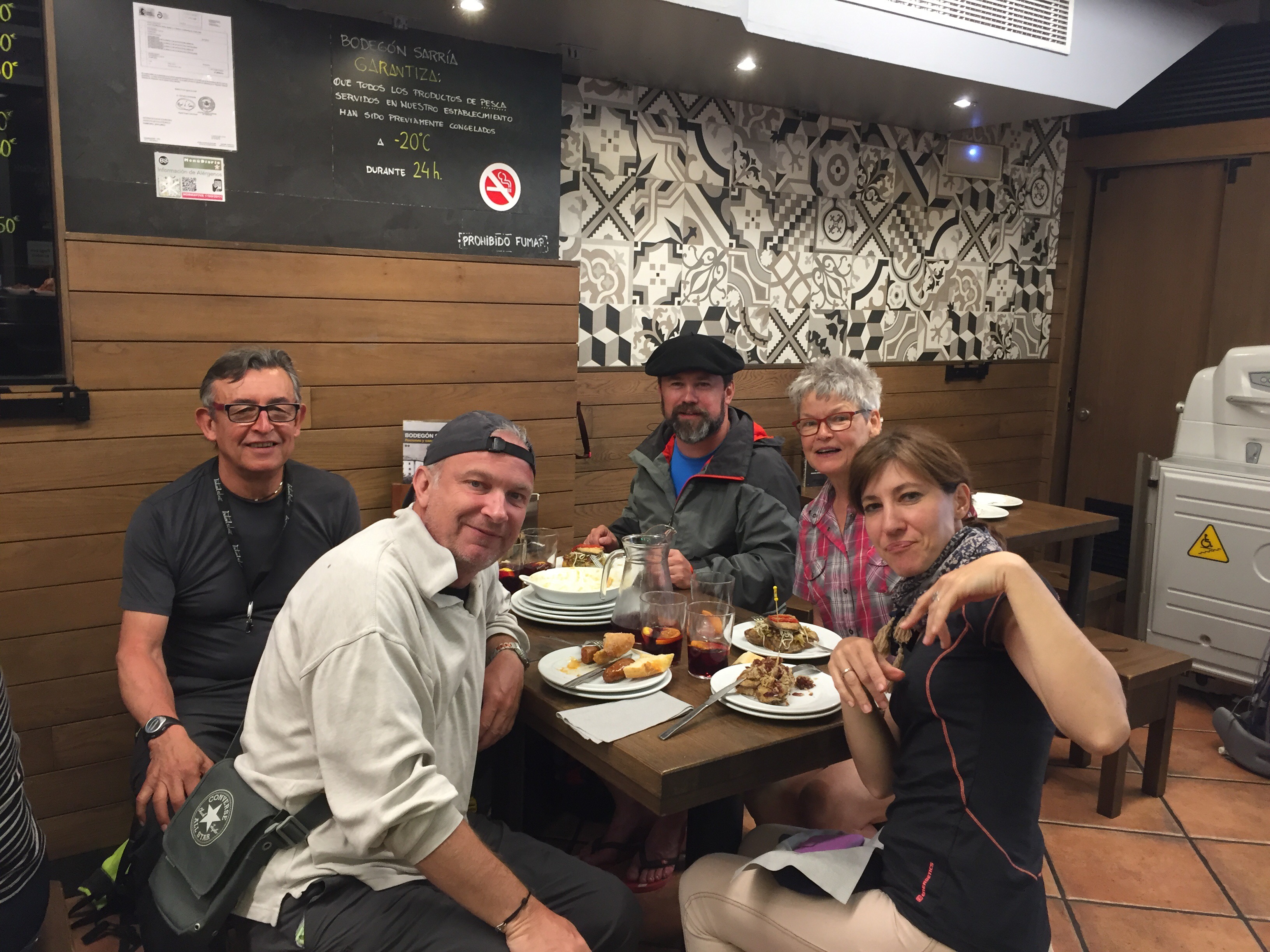 Continuada la marcha, seguimos hasta Villava y ya desde allí el recorrido hasta Pamplona es casi todo urbano. Como veníamos con mucho adelanto sobre el resto, nos dimos una vuelta por la ciudad hasta la catedral donde estaban con una misa especial y de allí seguimos el paseo hasta la Plaza del Castillo, donde les esperamos en una terraza. Una vez que llego el resto del grupo y hubieron descansado, recorrido por la calle Estafeta y como querían comer cosas típicas, nos metimos en un bar de esa misma calle donde tomamos jamón, queso, tortilla y huevos rotos con ajo arriero, además de unos excelentes pinchos, todo regado con sangría a solicitud de mis compañeros de viaje.