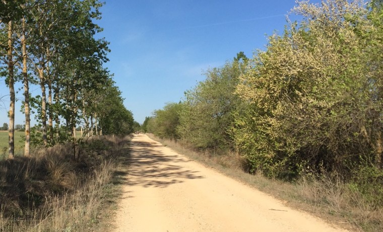 castellana. Son casi 17 km sin ningún pueblo intermedio. La senda discurre primero por una carretera comarcal, que se transforma en camino agrícola más adelante. En uno y otro caso, prácticamente sin circulación por lo que durante todo el trayecto se pueden escuchar los sonidos de la naturaleza, fundamentalmente pájaros diversos -con el cuco que sigue presente de forma continua-, y un poco más tarde, también grillos y otros insectos.