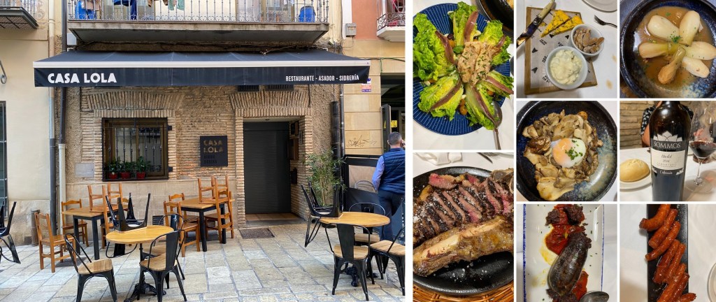 La cena estaba reservada de antemano en Casa Lola, una sidrería que Arantxa y Chema conocían. Volvimos a degustar los productos tìpicos de la huerta navarra, como son los Cogollos con anchoas, Cebolletas estofadas, Chistorra de Arbizu, Boletus con foie y huevos rotos, Morcilla, y además de un espléndido chuletón de vaca vieja. El restaurante estaba totalmente lleno, lo que justifica la buena valoración que tiene. Y aunque después de la cena hubiese sido un momento excelente para sentarse a tomar un digestivo, nuestros amigos que estaban algo cansados prefirieron ir directamente al hotel, lo que hicimos todos.