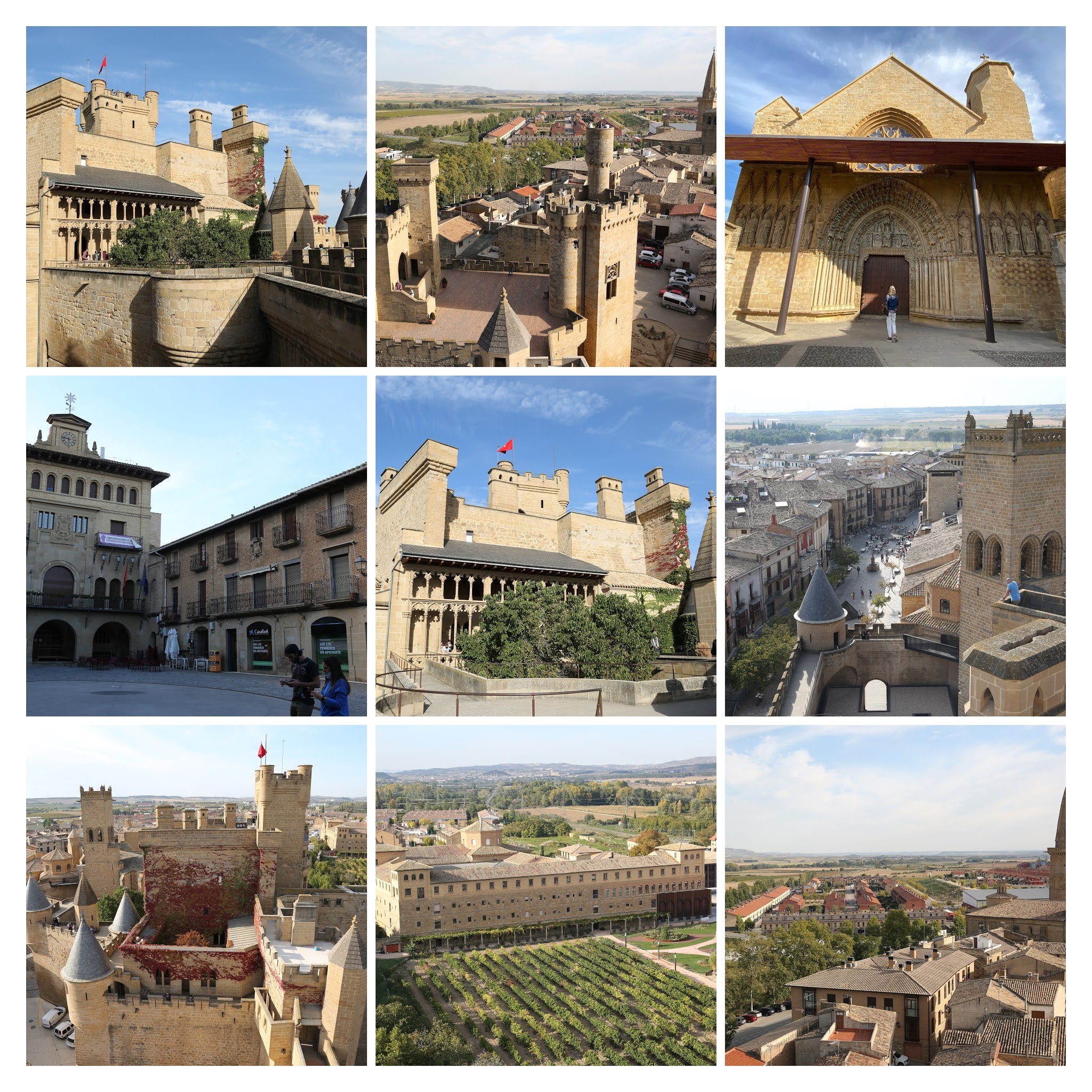 Entre recorrido y paradas estuvimos en el parque casi 4 horas y como se acercaba la hora de comer optamos por ir a tomar algo rápido a Olite, cuya visita habíamos planificado para la tarde. Asi que, llegados a destino, localizamos una mesa en la terraza de uno de los bares de la plaza principal y allí hicimos un ligero refrigerio a base de pinchos, pensando en que para la cena estaba ya reservado algo especial en Tudela. La comida fue rápida y dedicamos el resto de la tarde a visitar en primer lugar la iglesia de Santa María la Real, un templo gótico del S-XII, y a continuación el Palacio Real de Olite, un castillo que está totalmente reconstruido y tiene multitud de estancias y torres con almenas de muy diversas alturas. Está contiguo al actual Parador, que en otros tiempos fue el viejo castillo. Yo había estado un par de veces antes en Olite y en las dos ocasiones hice la visita a ese castillo pero no recordaba tales dimensiones. Resultó otra oportunidad para fotografiar el lugar y la villa en su conjunto desde diferentes miradores en las mencionadas torres y almenas. Esta visita prácticamente nos consumió el resto de la jornada.