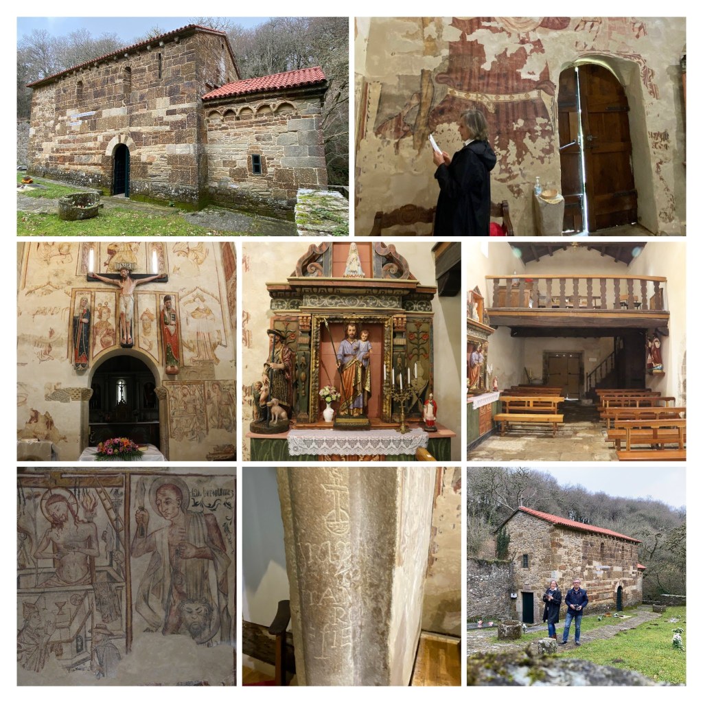 Y desde allí, comenzamos la visita, empezando por la Iglesia de San Antoniño de Toques, para lo cual nos facilitaron las llaves. Tiene mucha historia, ya que data del año 1067, siendo en realidad la continuación de una capilla del S-VII adosada a una peña en un monte próximo. En sus inicios fue un monasterio y como todas las construcciones de ese tipo ha pasado por numerosas fases y problemas. De lo que hoy queda construido cabe destacar unas preciosas pinturas murales que datan del S-XV y que fueron restauradas entre los años 2012-2015. También es de destacar «O Calvario» del S-XII.
