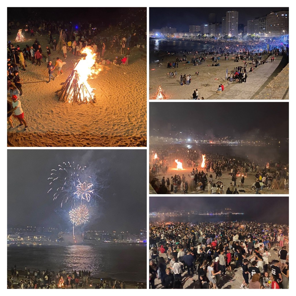 Y se me ha ocurrido el generar esta publicación precisamente hoy porque ayer era un día muy especial para la ciudad. Como ocurre desde hace muchos años, la víspera de San Juan concita a coruñeses y parroquianos del cinturón de la ciudad miles de personas que quieren disfrutar de la noche mágica en las playas de Orzán-Riazor. Desde la noche anterior los jóvenes acuden a las playas para «montar guardia» y preparar sus parcelas para el día siguiente, juntándose al final miles de personas (esta mañana el responsable del dispositivo de seguridad estimaba que la afluencia a estos arenales había sido de aproximadamente 125.000 personas). Y eso contando además con que en esta ocasión coincidía el San Juan con un concierto de Alejandro Sanz en el Coliseo, que con toda seguridad se ha llenado. Y además de la zona de playa, también en muchos de los barrios de la ciudad hubo numerosas hogueras y sardiñadas-churrascadas, con gran participación ciudadana.