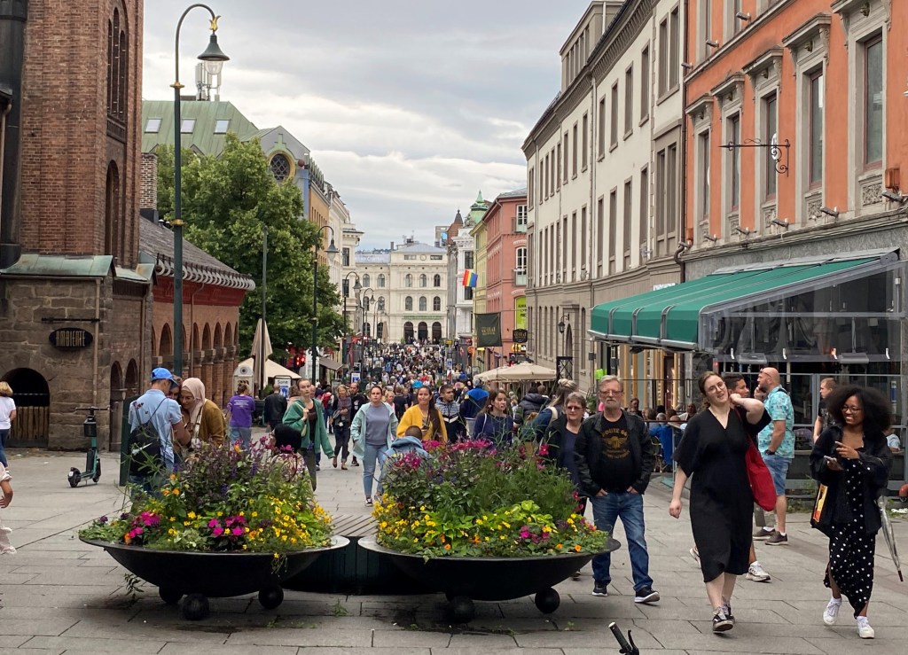 Ya en Busterminal, en el centro de Oslo, hemos empezado nuestro paseo por la calle principal, Karl Johans Gate, peatonal y con multitud de comercios y cafés. Lo primero que vimos fue un edificio contiguo a la catedral, lleno de cafeterías. También pudimos enterarnos de que en la catedral, el viernes 22, se celebraba un acto con música de órgano del que tomamos nota.