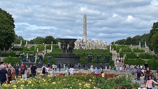 Efectivamente el parque es enorme, muy bien cuidado, y como sabíamos, existe una grandísima colección de esculturas de forma humana, bien individualmente hombres mujeres y niños, como agrupadas de dos en dos, en muy diferentes posiciones. En lo alto de la zona principal se alza el Árbol de la Vida, con esculturas de figuras humanas (niños, mujeres y hombres) aparentemente amontonadas que simbolizan los deseos de cada uno de mejorar. Y además en el entorno hay varias líneas de figuras agrupadas de dos en dos, señalando diferentes etapas de la vida.