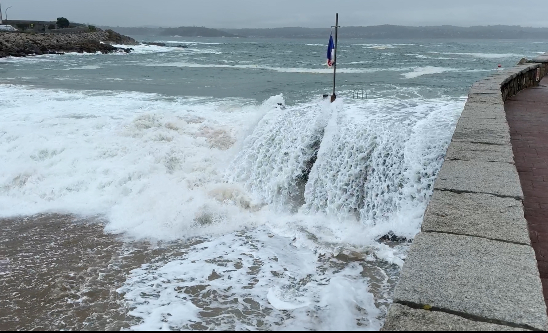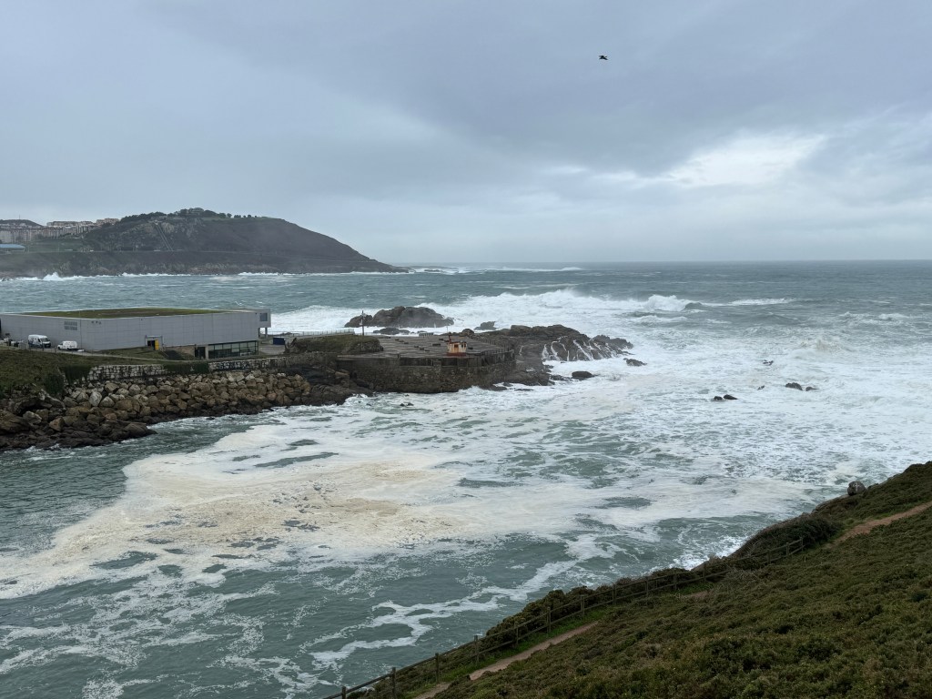 En la playa de San Amaro, sin ser tan fuerte el temporal, también se dejaba notar la diferencia entre una jornada normal y un día de mar fuerte. Tal vez lo más llamativo era que, sin estar la marea totalmente alta, el romper de las olas sobre el «teórico embarcadero» hacía que estas sobrepasasen la parte alta volcándose del otro lado, aunque sin alcanzar la zona de paso que bordea al Club del Mar.