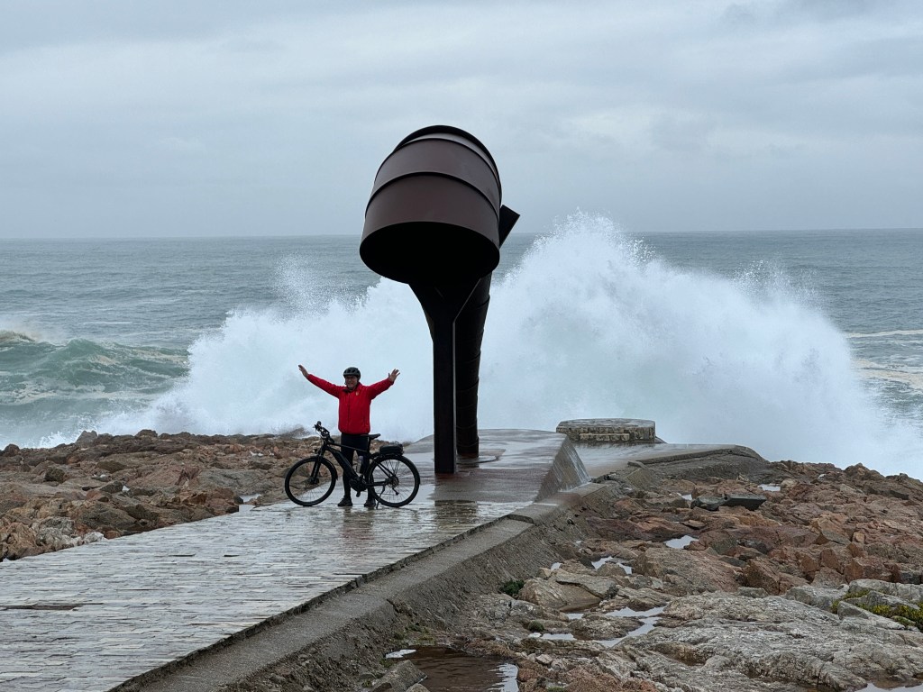Por esa razón opté por dirigirme hacia ese saliente de Punta Herminia, donde sin duda podría valorar de cerca la potencia del mar al romper sobre las rocas. Como quiera que el espectáculo llama la atención de quienes circundan la zona, me encontré con unos ciclistas que tenían interés en dejar constancia de que habían estado allí en esas circunstancias, y poco después también una pareja de turistas que dijeron venir de Sevilla, de los cuales él resultó ser el más aguerrido (mientras ella le recriminaba su acercamiento al límite de las olas), quienes me pidieron que inmortalizase en su móvil el momento. En una de esas embestidas de las olas, la espuma resultante regó al turista sevillano, mientras su pareja le gritaba que se acercase.