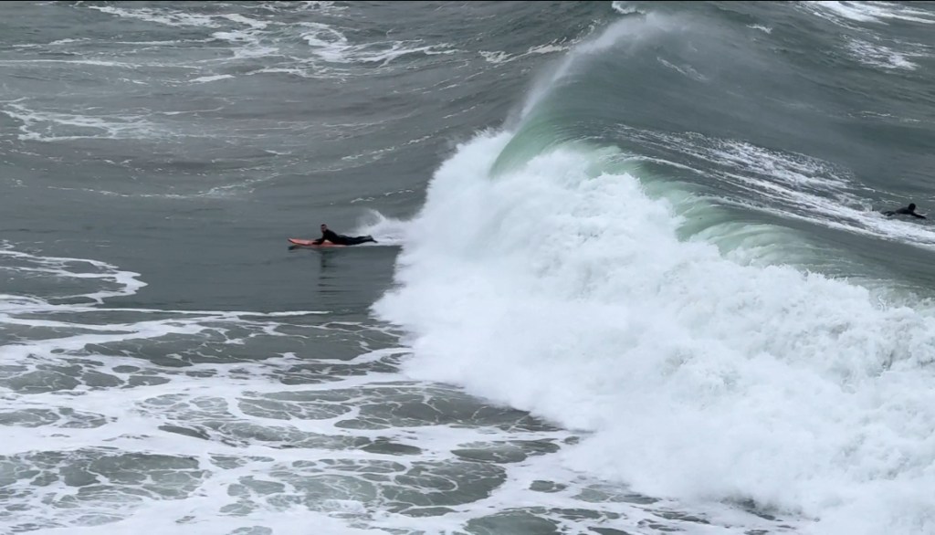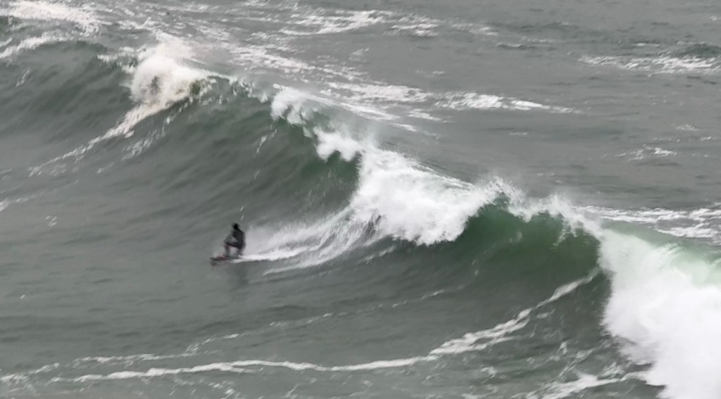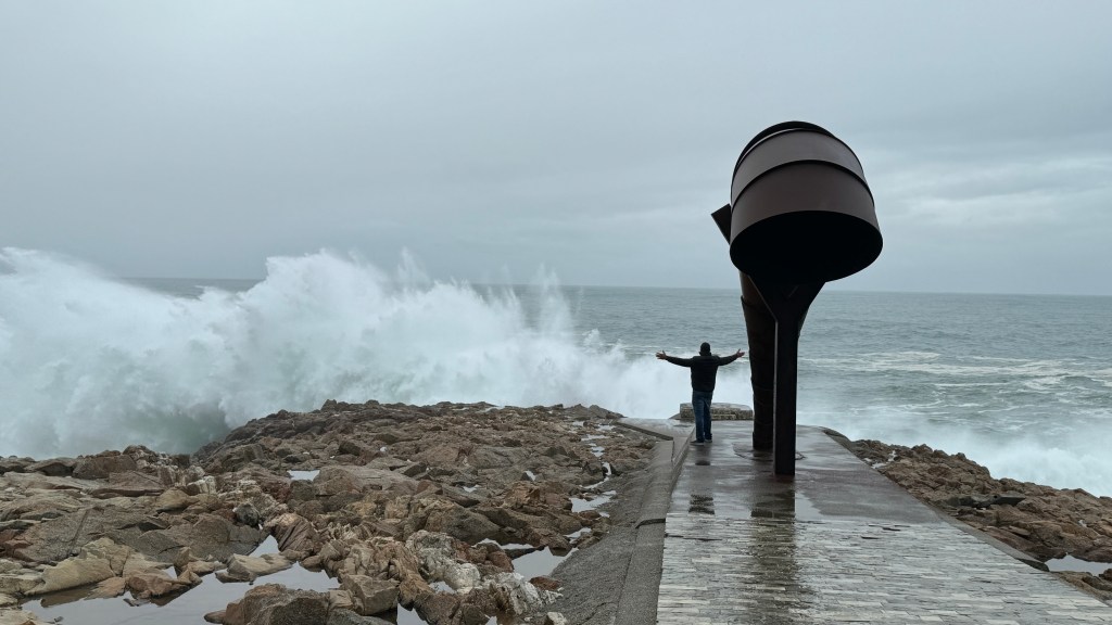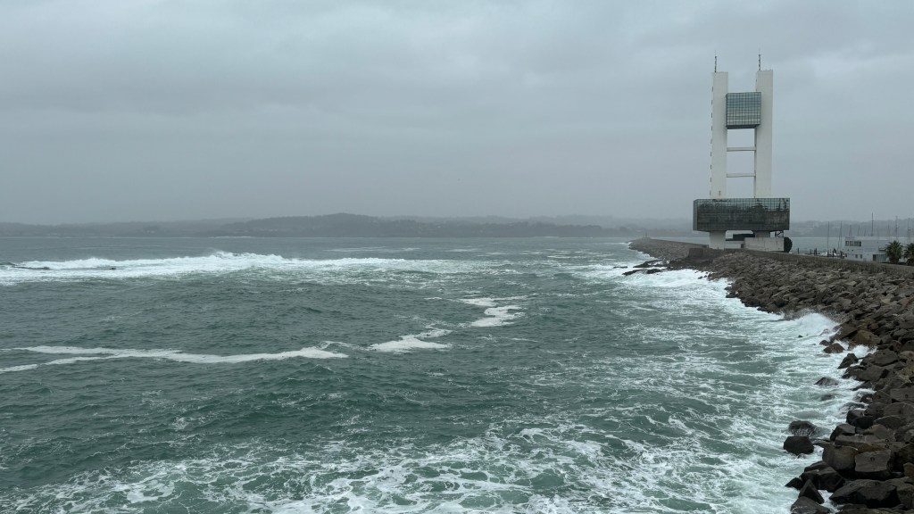 Ya desde el inicio del paseo, en las ensenadas de Riazor y el Orzán se podía comprobar la bravura del mar y continuando el recorrido hacia la torre, recién superada la playa de matadero (en su día esa zona se conocía como Berbiriana, según supe en fecha reciente), un reducido grupo de intrépidos surfistas desafiaba las inclemencias meteorológicas para disfrutar de su deporte favorito. Eran solo cuatro, y entre ellos uno parecía ser el mejor preparado y quien afrontaba con más seguridad cabalgar sobre las olas.