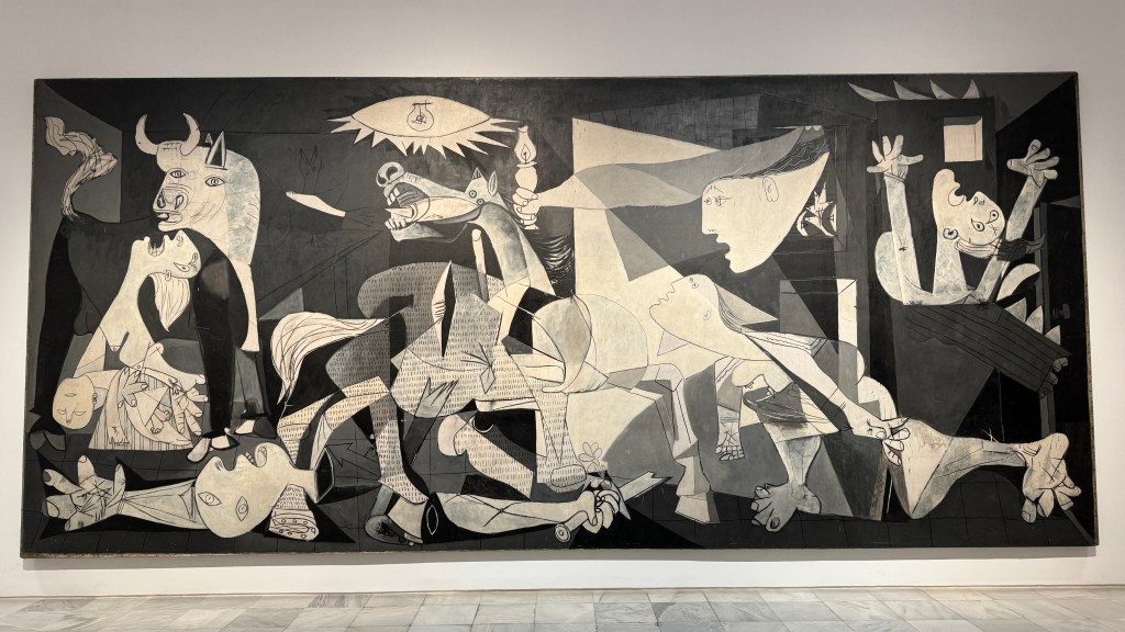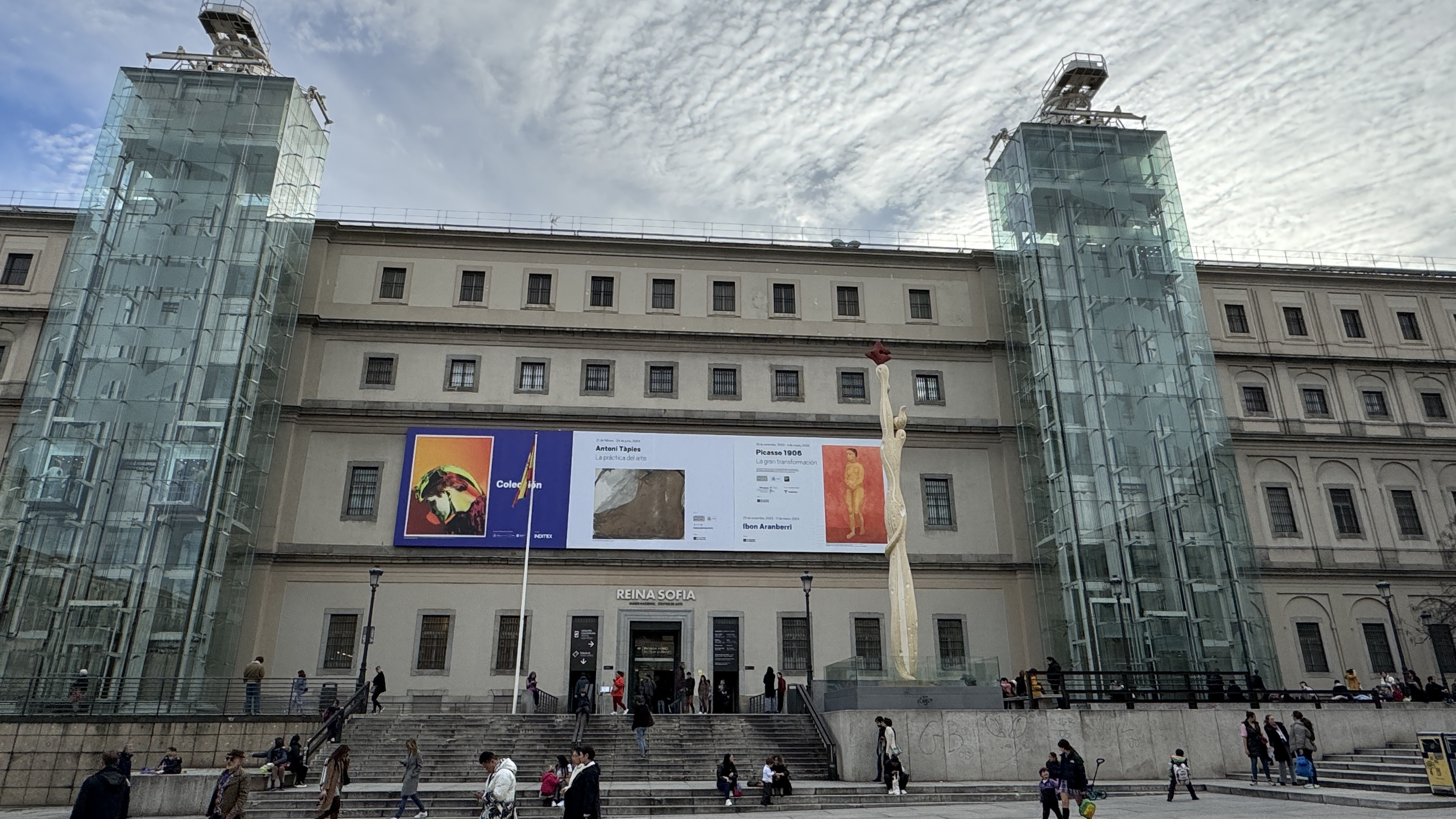 El Reina Sofía, al que ya hacía muchos años que yo no acudía, nos resultó un tanto monótono, aunque pudimos volver a contemplar el Guernica y bastantes otras obras de Picasso, de Miró y de otros muchos artistas, aunque no pudimos ver una exposición temporal de Tapies que se inauguraba la semana siguiente. Nos sorprendió ver, cuando salimos, la enorme cola que se había formado a la entrada del museo porque varios días de la semana a partir de las 7 de la tarde el acceso es gratuito.