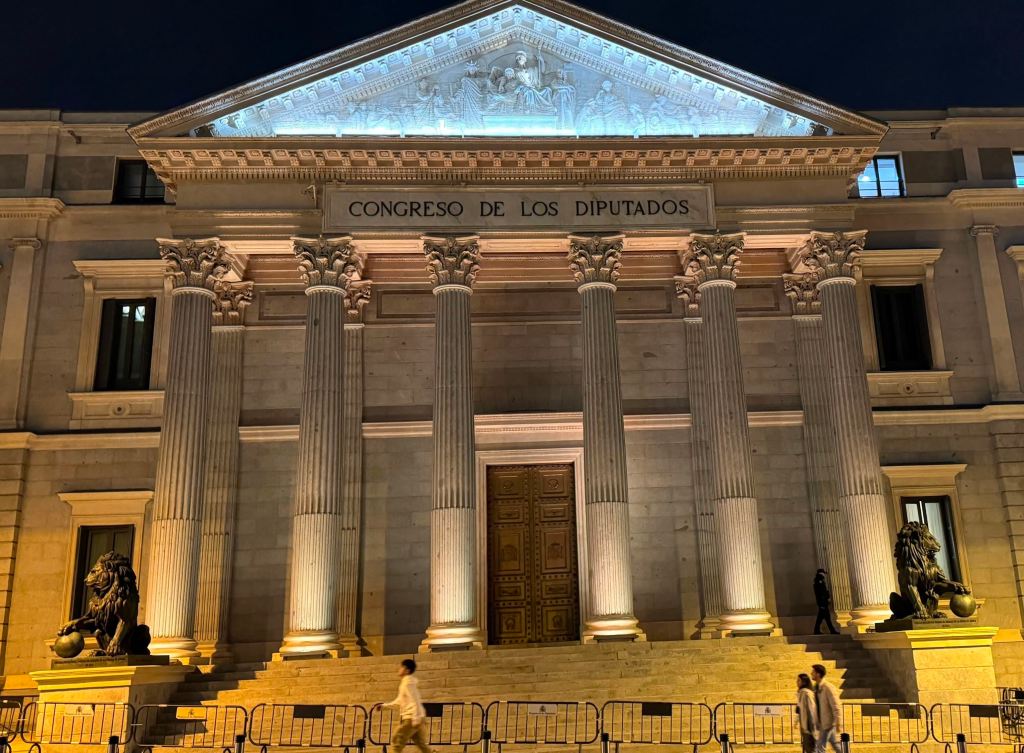 Al salir del museo fuimos tranquilamente caminando por el Paseo del Prado hacia la Carrera de San Jerónimo, y ya en esta calle nos sorprendió a las 8,00 horas de la tarde un reloj ubicado justo en el edificio que está frente al Hotel Palace, en el que al dar la hora salían al exterior de la ventana una serie de figuras mientras tocaba una conocida melodía. La verdad es que ese reloj seguro que está allí desde hace muchos años y solo Berta y Ramón tenían conocimiento de ello, aunque ninguno de los cuatro había tenido ocasión de admirarlo antes. Continuando hacia la Plaza de Canalejas, vimos iluminado el Congreso de los Diputados.