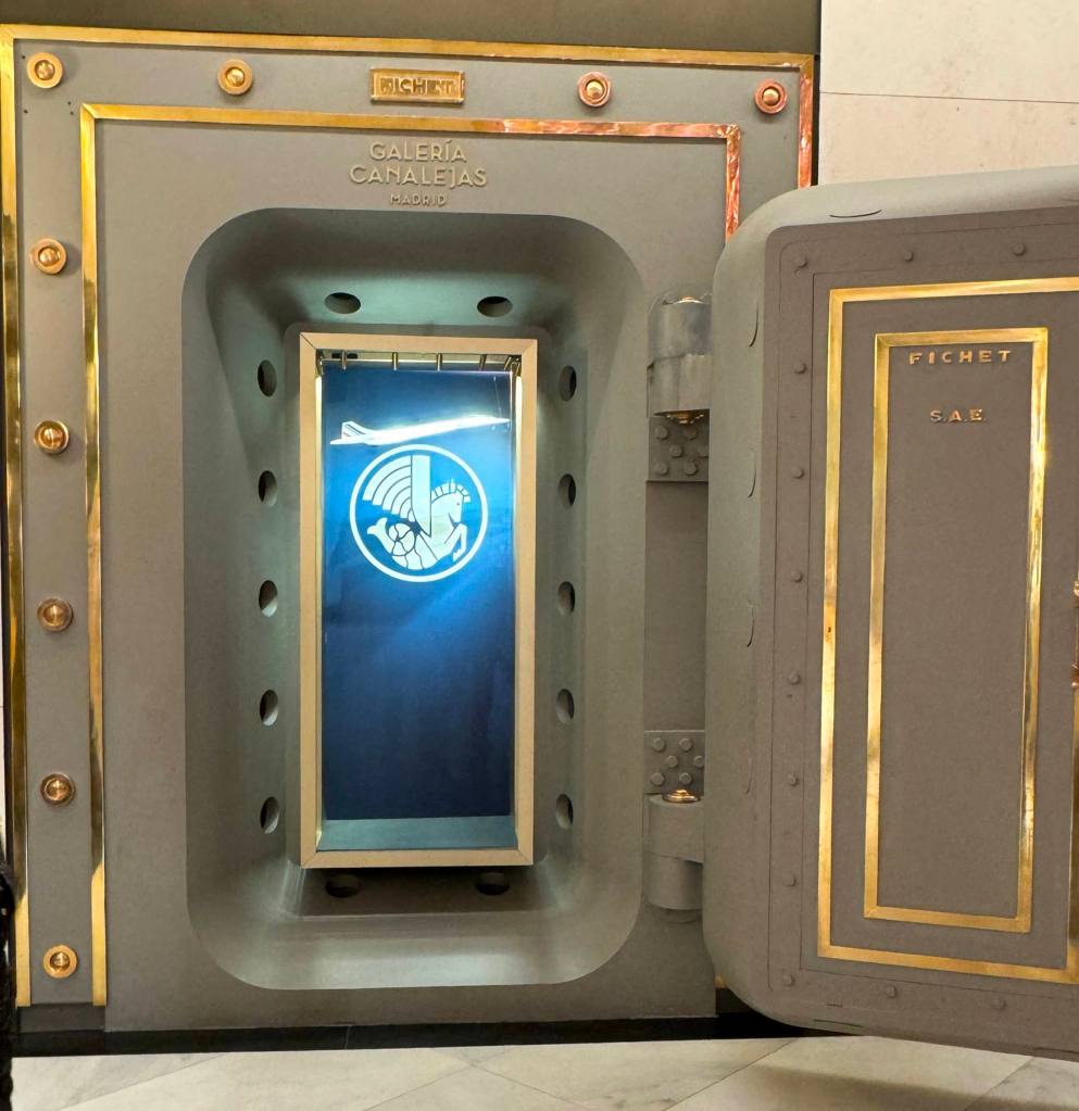 Al llegar a la plaza pudimos contemplar la gran transformación que ha tenido el edificio que fue la antigua sede principal del Banco Hispano Americano, donde en mi etapa joven estuve numerosas veces por motivos de trabajo. Ahora el edificio ha sido por completo reformado en su interior y alberga un centro comercial de super lujo, con las tiendas de mayor relieve, y en el que curiósamente se conserva la puerta de acceso a la que fue la cámara acorazada del Banco, que aprovechamos para fotografiar. El interior se ha unido al de otro edificio anexo, que tenía su frente y acceso por la calle Alcalá, con lo cual el centro comercial es amplísimo.