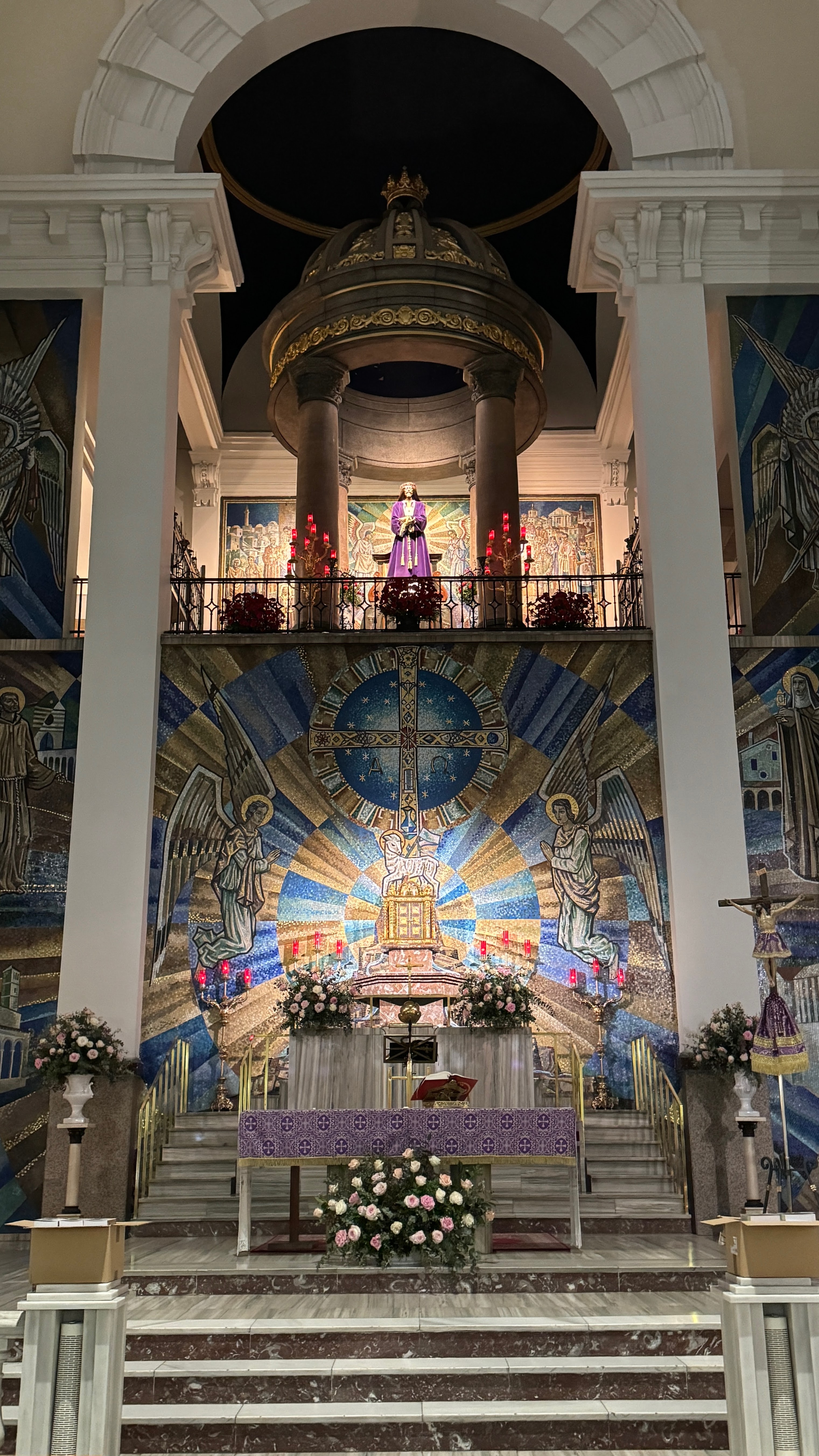 A la mañana siguiente salimos a desayunar tratando de encontrar algún sitio donde tomar unas porras, pero en la cafetería más próxima que encontramos, llamada Granja Blanca, no las tenían, así que hubimos de conformarnos con unos simples churros y tostadas. A pocos metros de la cafetería y del hotel está la iglesia de Jesús de Medinaceli, cuya cúpula por cierto es visible desde nuestra habitación. Parece ser que en esa iglesia se forman largas colas para contemplar y besar la imagen del Cristo, y como ninguno de los dos conocía el templo, entramos a visitarlo. La iglesia estaba vacía, y la verdad es que no nos causó ninguna impresión especial.