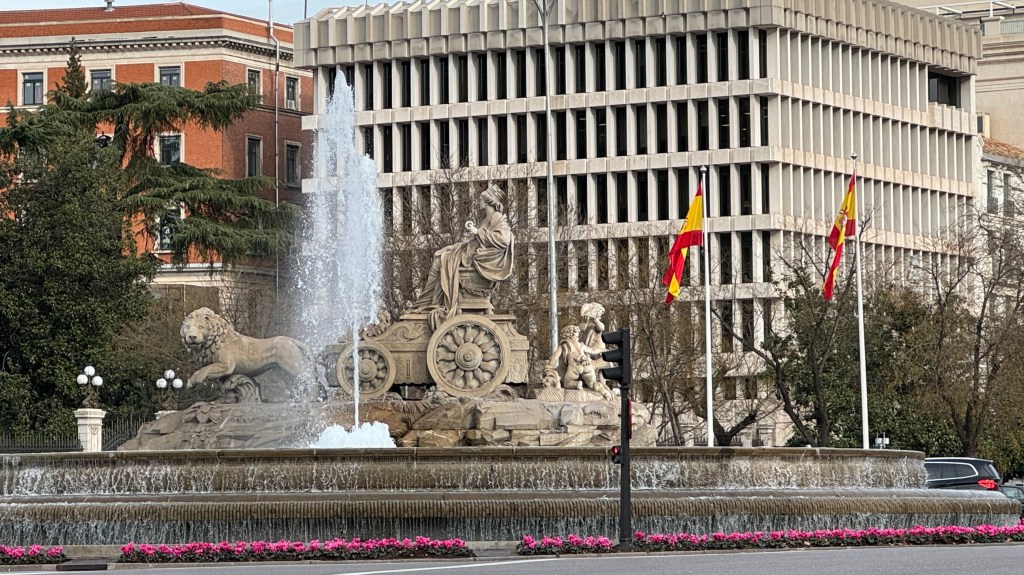 Tras el desayuno, comenzamos nuestro periplo de visitas del día, consistente en recorrer el paseo de Recoletos hacia la Castellana. En Cibeles Ipi pudo hacerse una primera idea del cruce de calles, ya que es el punto de partida del Paseo del Prado, Paseo de Recoletos, y que parte en dos la Calle de Alcalá, porque desde allí se divisa en un sentido la Puerta de Alcalá y del contrario el comienzo de la Gran Vía. Con todos los edificios que circundan la plaza, es decir antiguo edificio de Correos ahora ocupado por el Ayuntamiento de Madrid, Casa de America, Banco de España y jardines y edificio del Ministerio de Defensa.