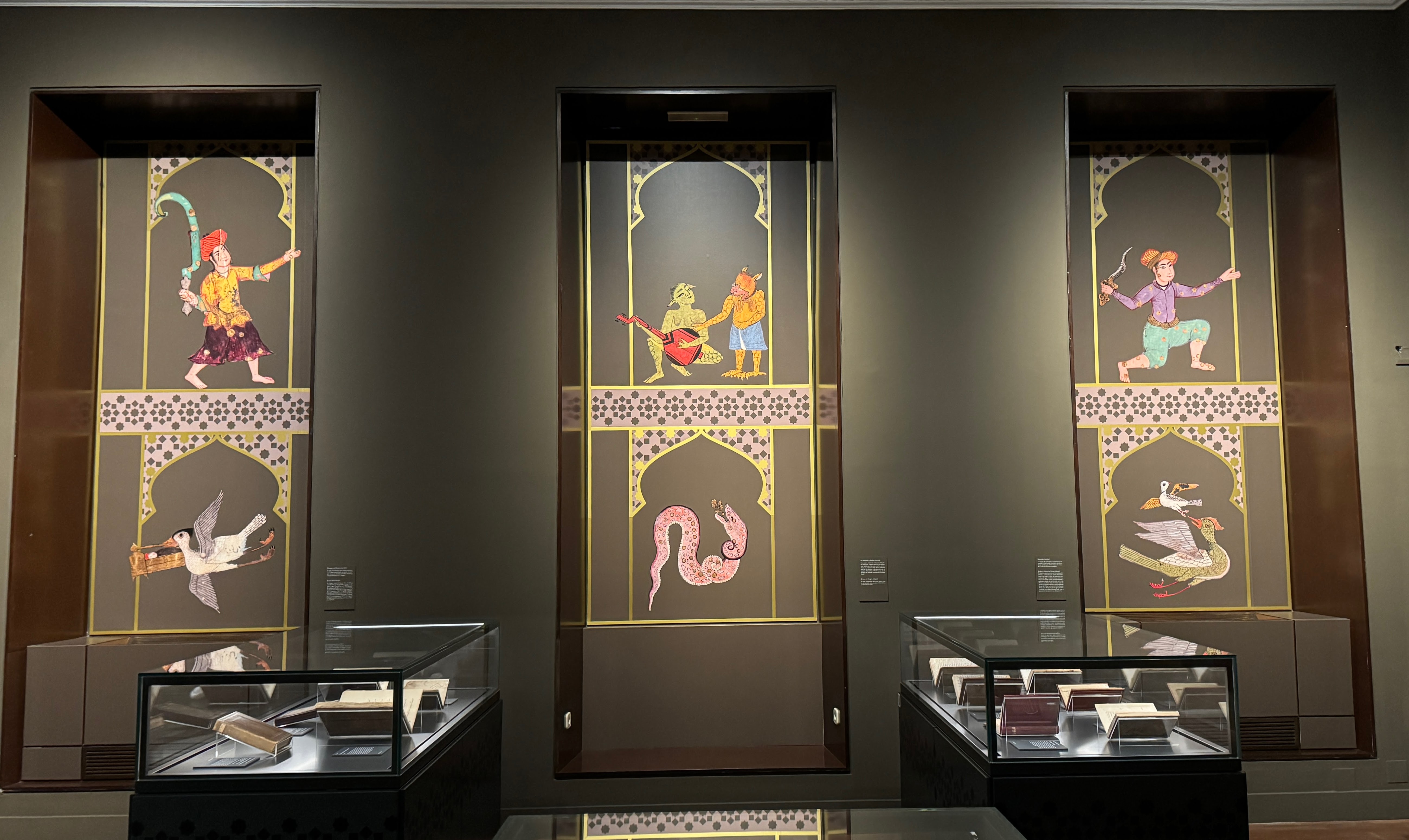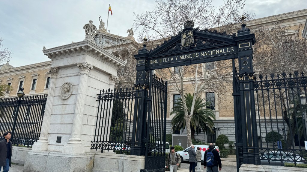 Continuando hacia la Plaza de Colón, en la idea de visitar la exposición de Marc Chagall que acababa de ser inaugurada en el museo de la Fundación Mapfre, nos encontramos con que aunque la apertura de puertas era a las 11 de la mañana, había ya algo de cola, por lo que decidimos continuar hacia el norte para visitar entretanto la Biblioteca Nacional, que ninguno de los dos conocíamos. El edificio que alberga numerosas joyas de nuestra literatura apenas puede ser visitado más que en su entrada y algunas salas, salvo que hayas solicitado autorización para consultar obras concretas que te den acceso a la sala de la biblioteca, si estás preparando una tesis doctoral o algo similar. En esta ocasión estaba abierta al público una exposición de manuscritos Persas de varios siglos atrás, en la que pudimos observar ejemplares magníficos procedentes de antiguos exploradores y viajeros españoles por aquellas tierras.