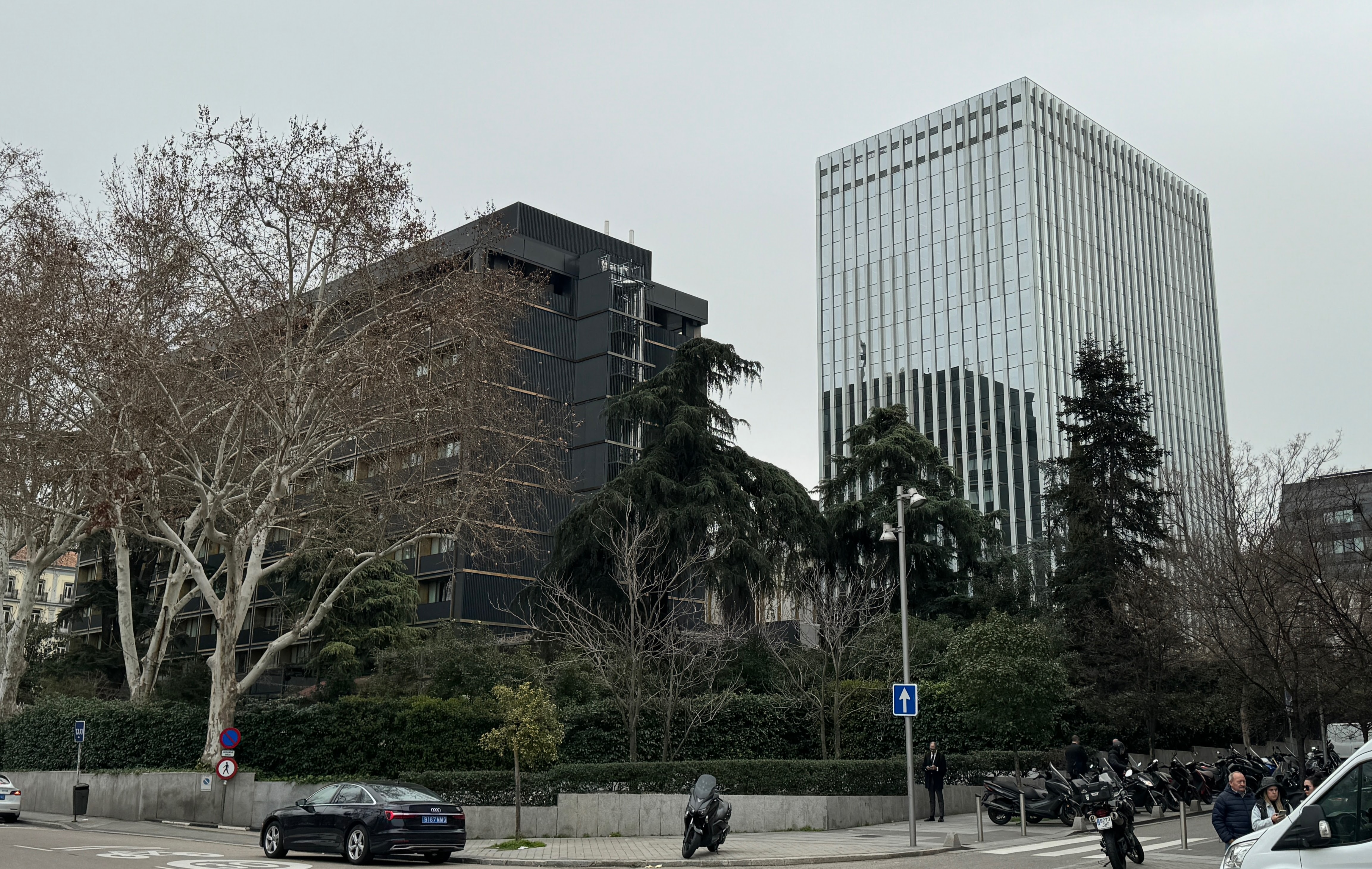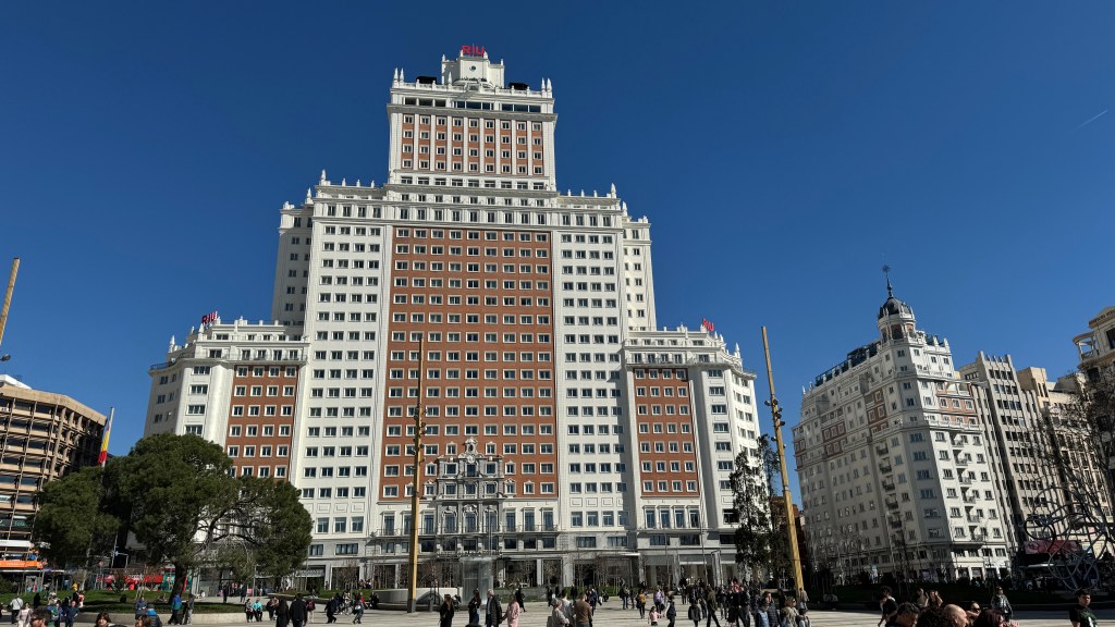 Terminada la visita a la biblioteca, que nos causó una grata impresión, retornamos al museo Mapfre, para comprobar que la cola, ahora en el interior, había aumentado y solo despachaban entradas para visitas a partir de la una de la tarde, por lo que decidimos dejarla por el momento hasta saber si Berta y Ramón, que habían quedado con nosotros para más tarde, estaban interesados en asistir también. De modo que continuamos hacia el norte, pasando por la Plaza de Colón e iniciando el Paseo de la Castellana, donde poco más adelante nos topamos con los edificios del Hotel Villamagna y el contiguo, con acceso por la calle de Serrano, del que en su día era el edificio del BHA donde se ubicaban los departamentos de extranjero, y donde yo trabajé en el Departamento de Relaciones Exteriores durante 14 meses entre los años 1974 y 1975, lo que me hizo recordar lo «madurito» que soy porque desde aquella estancia mía en Madrid han pasado ya 50 años.