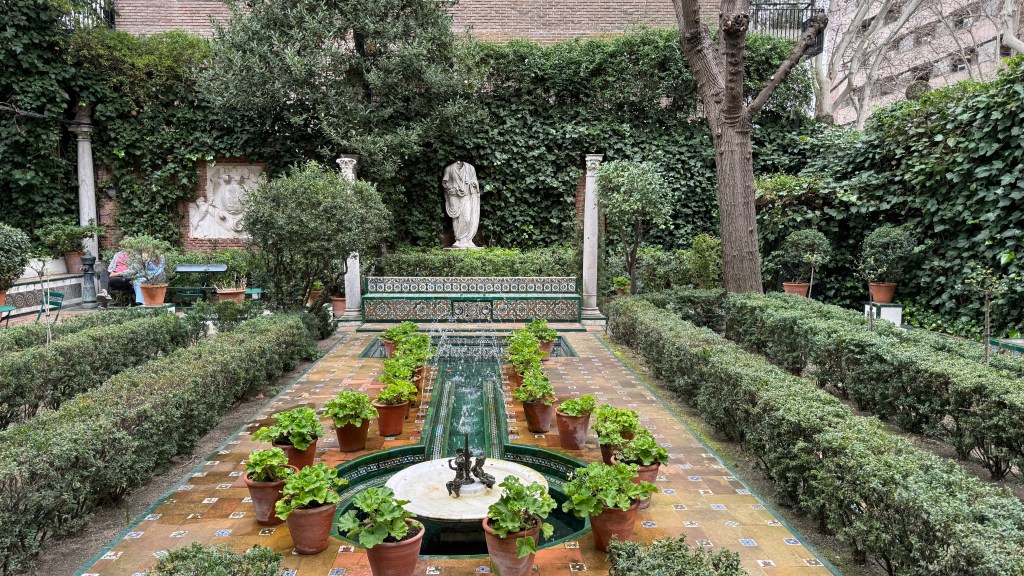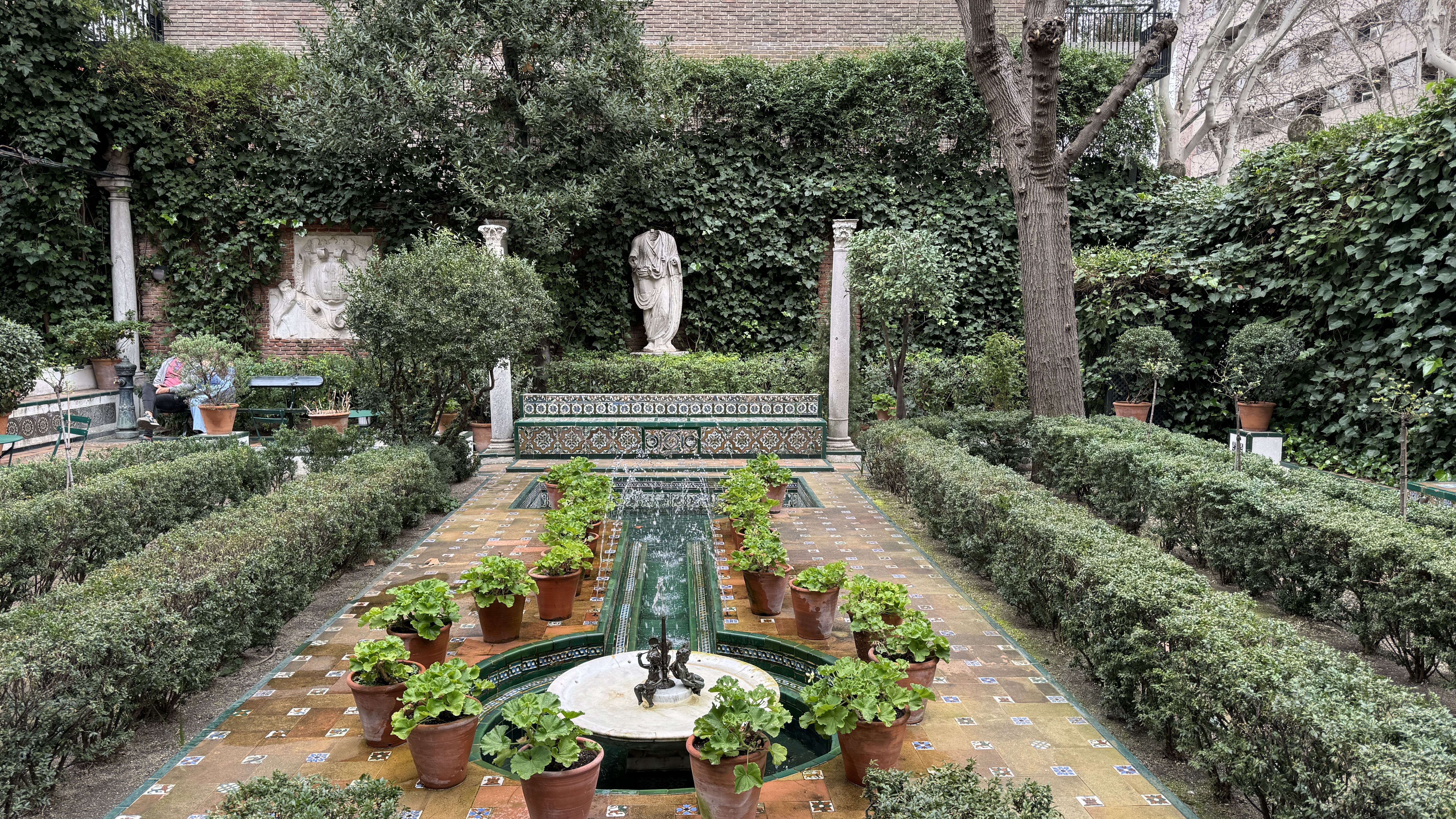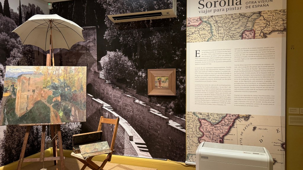 Continuando Castellana arriba, decidimos ir a visitar el Museo Sorolla donde más tarde se reunirían con nosotros Berta y Ramón. El museo está ubicado en la que fue la casa del pintor, que tiene en su exterior unos bonitos jardines con fuentes, y que guarda una gran parte de las obras que pintó a lo largo de su vida. Allí se guardan además numerosos recuerdos que fue atesorando, sus útiles de pintor, y hay una extensa colección de las obras y borradores utilizados para los frescos que le fueron encargados por Archer Milton Huntington para la Hispanic Society de Nueva York, donde se representan escenas de las diferentes regiones españolas y que este año, con motivo de su centenario, dió lugar a numerosas exposiciones en diferentes ciudades (una de ellas en A Coruña), bajo el título de Sorolla, viajar par pintar.