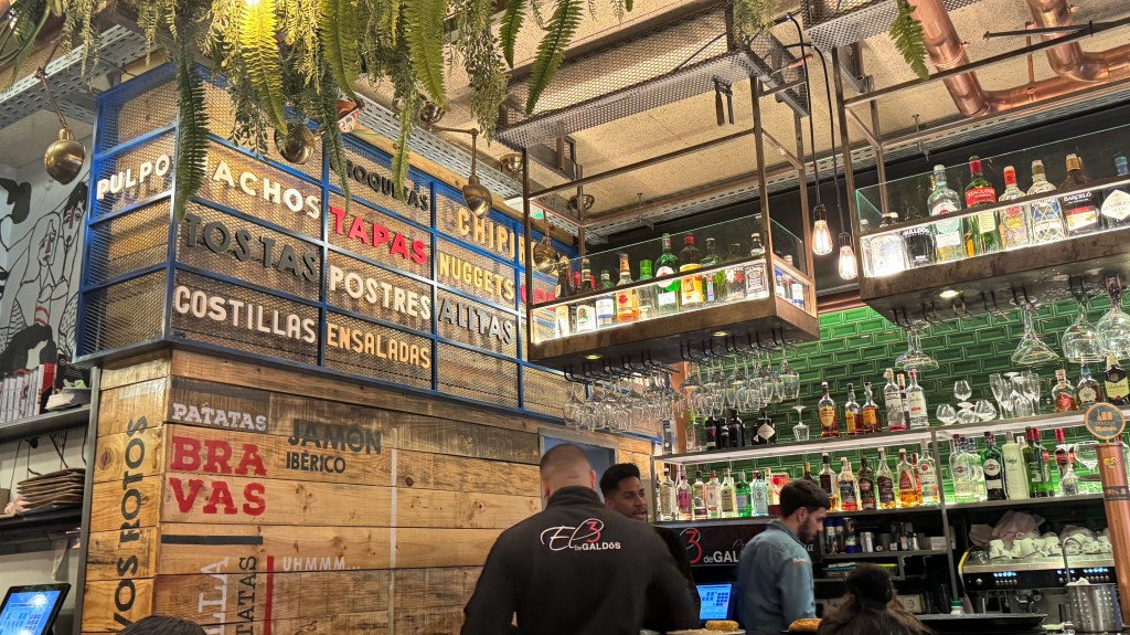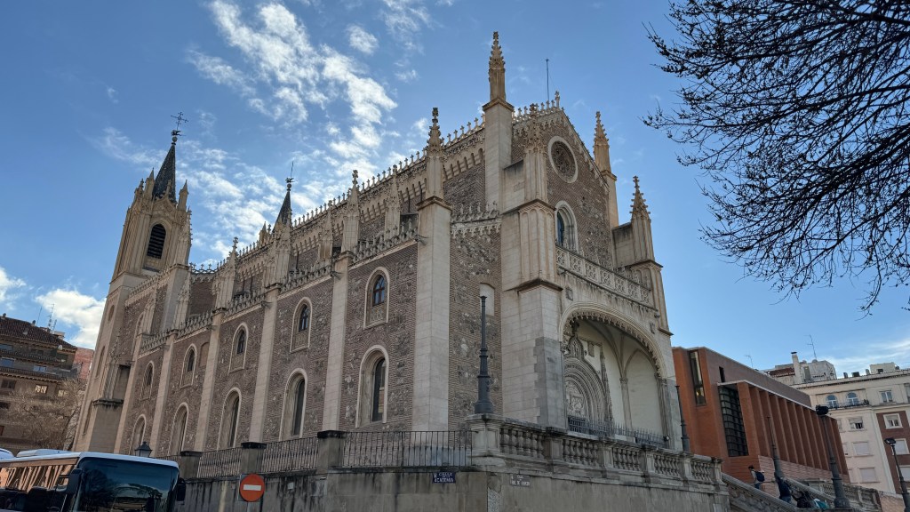 Para desayunar el sábado seguimos buscando un lugar donde comer porras, y lo encontramos al inicio de la calle del Prado, muy cerca del hotel, para seguir después nuestro recorrido hacia la Puerta del Sol por las calles del centro y con una parada en un comercio (Loué) del que David le había hablado a Ipi, en la calle Virgen de los Peligros entre Alcalá y la Gran Vía, para continuar después por la calle Mayor hasta llegar a la Almudena. Nos encontramos con numerosos grupos de turistas que hacían recorridos «free tour» lo que confirmaba mi comentario anterior de que en los fines de semana el paisaje ciudadano cambia de forma ostensible.