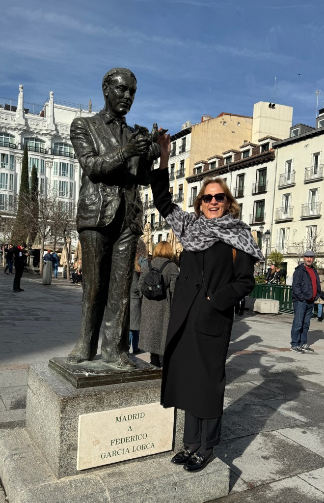 Para esta última jornada habíamos dejado un paseo por el barrio de las Letras, partiendo desde el Palace por la calle del Prado hacia la plaza de Santa Ana, donde Ipi quiso fotografiarse junto a la estatua allí levantada en recuerdo de Federico García Lorca. Continuamos luego hasta la Plaza Mayor y Teatro Real tras pasar por el Arco de cuchilleros y hacer una breve visita al Mercado de San Miguel, ahora parcialmente en obras.