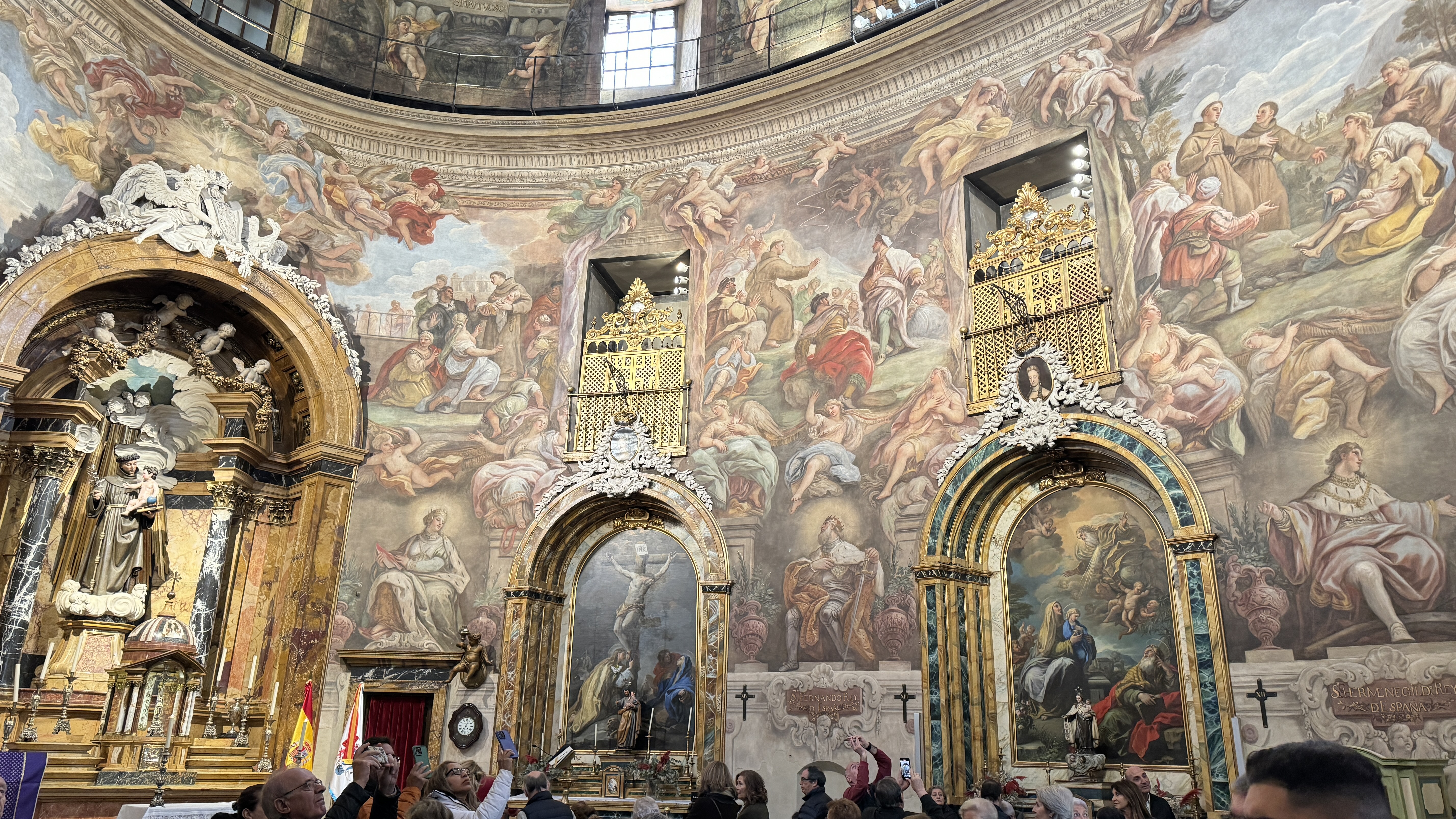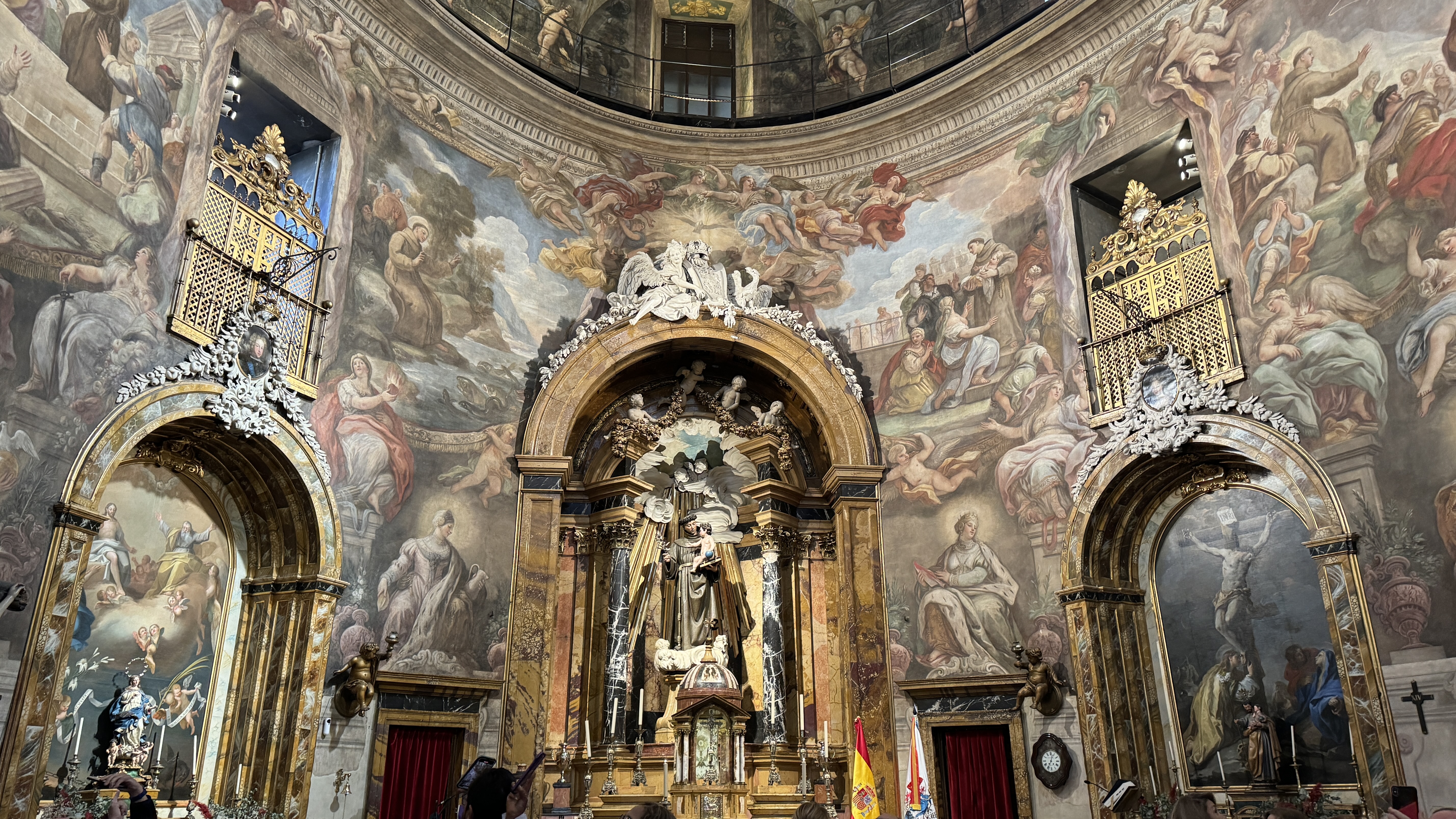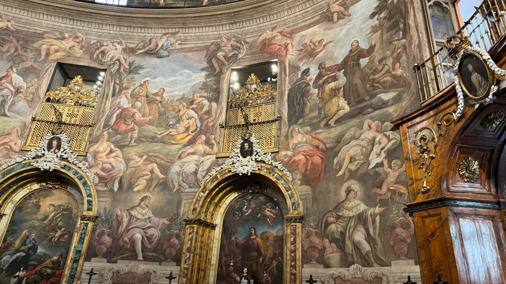 Y ya desde las Descalzas fuimos a buscar la iglesia de los Alemanes, oficialmente iglesia de San Antonio de los Alemanes, una iglesia barroca del siglo XVII, de la que nos habían dicho que valía la pena visitar por los preciosos frescos con que está decorado todo su interior. Está del otro lado de la Gran Via, haciendo esquina a la calle Puebla. Cuando llegamos empezaba la misa de las 12 por lo cual optamos por dar un paseo y esperar al final para poder verla con cierta tranquilidad. Y como quiera que las visitas ya no estaban permitidas a partir de esa hora, no nos quedó mas remedio que entrar cuando la misa estaba a punto de terminar para poder verla como un fiel más durante la celebración. La verdad es que valió la pena el desplazamiento y la espera posterior, porque es realmente bonita.