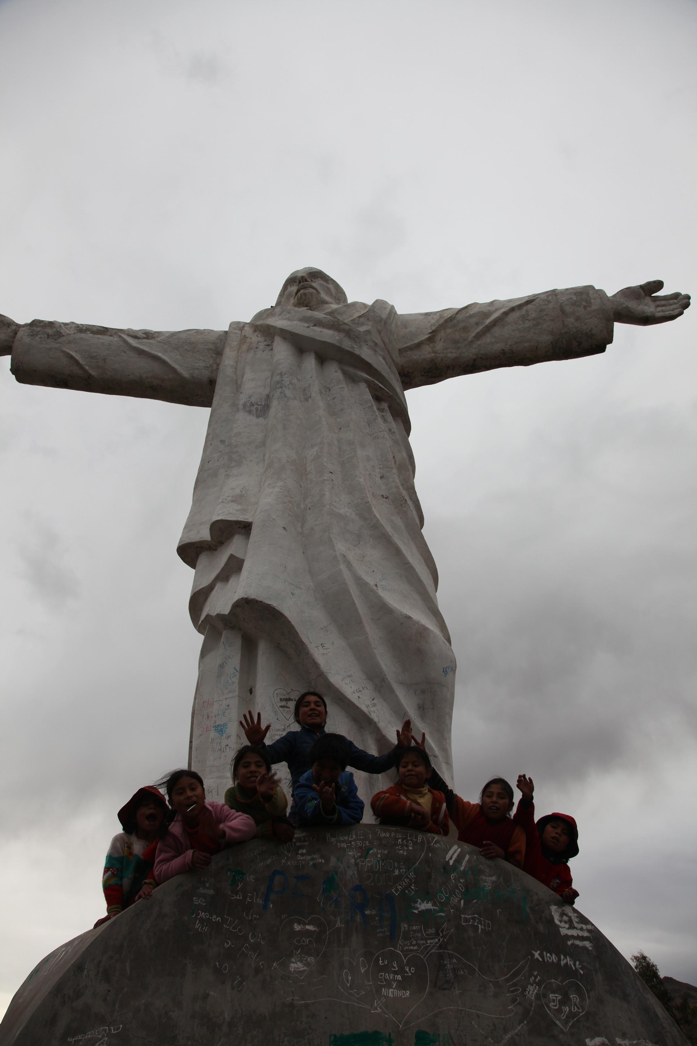 También el martes, como teníamos proyectado, llevamos a los chavales de excursión al Cristo Blanco, un monte próximo desde el que se tiene una vista global de Pomacanchi. Aunque la subida es dura, todos los críos incluso los más pequeños, subieron con una facilidad pasmosa y nosotros más que cuidándolos íbamos a remolque.  Lo pasaron bien, hicimos muchas fotos, y les llevamos unos zumos individuales y galletas de chocolate, como merienda especial.