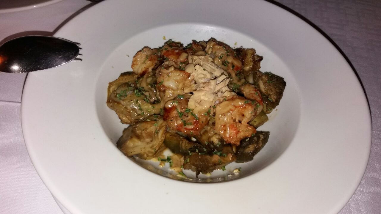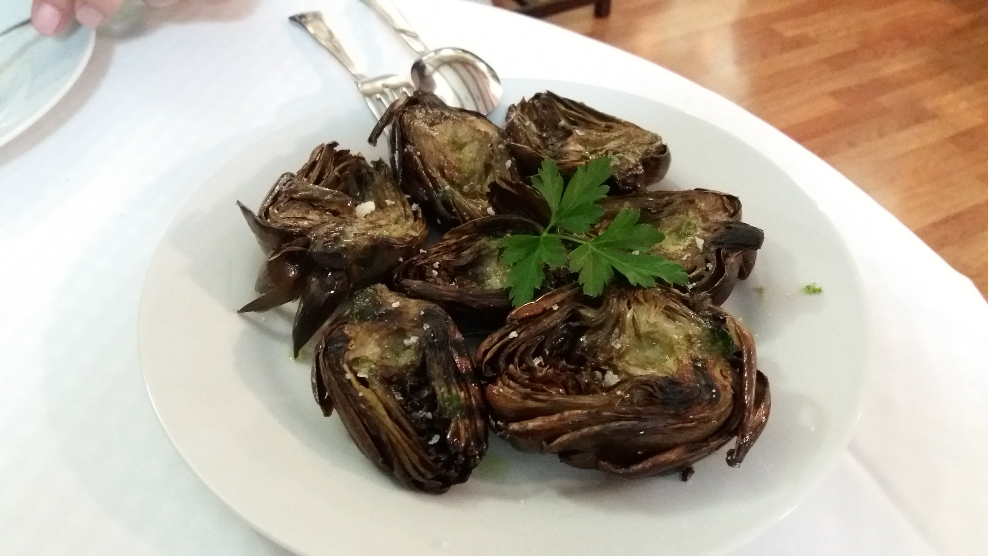 Con una parada previa para tomar algo en una terraza, desde alli hicimos ya viaje de regreso hacia nuestra zona de residencia para comer en Da Francesco, uno de los lugares que nos había recomendado Dario, el hostelero. También valió la pena el desplazamiento porque comimos muy bien, y pudimos alli probar las alcachofas que se exponian no solo en los mercados sino en muchos restaurantes como un producto de temporada. Son algo diferentes a las que vemos por aqui, tal vez algo más gruesas y con un color rosado. La preparación (fritas) fué excelente y tomamos nota para poder importar la receta. Y para remate, el postre lo dejamos para saborear los