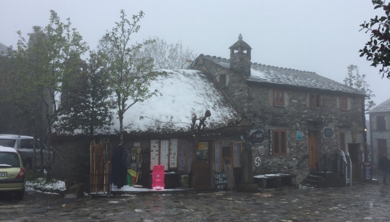 gran rodeo para retomar la ruta señalizada, y a partir de ese momento los 8 kms que conducen hasta Gonzar son de subida, con varias rampas Fuertes, aunque para mí hoy las subidas eran más llevaderas que los descensos. En esos 8 kms no hay nada destacable, ni siquiera un bar donde tomar algo, y en cambio justo antes de la llegada unos espabilados han montado un chiringuito que estaba abarrotado porque todos los peregrinos (y a esas horas ya eran muchos los que circulábamos por esa ruta) se pararon allí. Yo no fui una excepción y aproveche para tomar un bocata de tortilla francesa y un zumo de naranja.