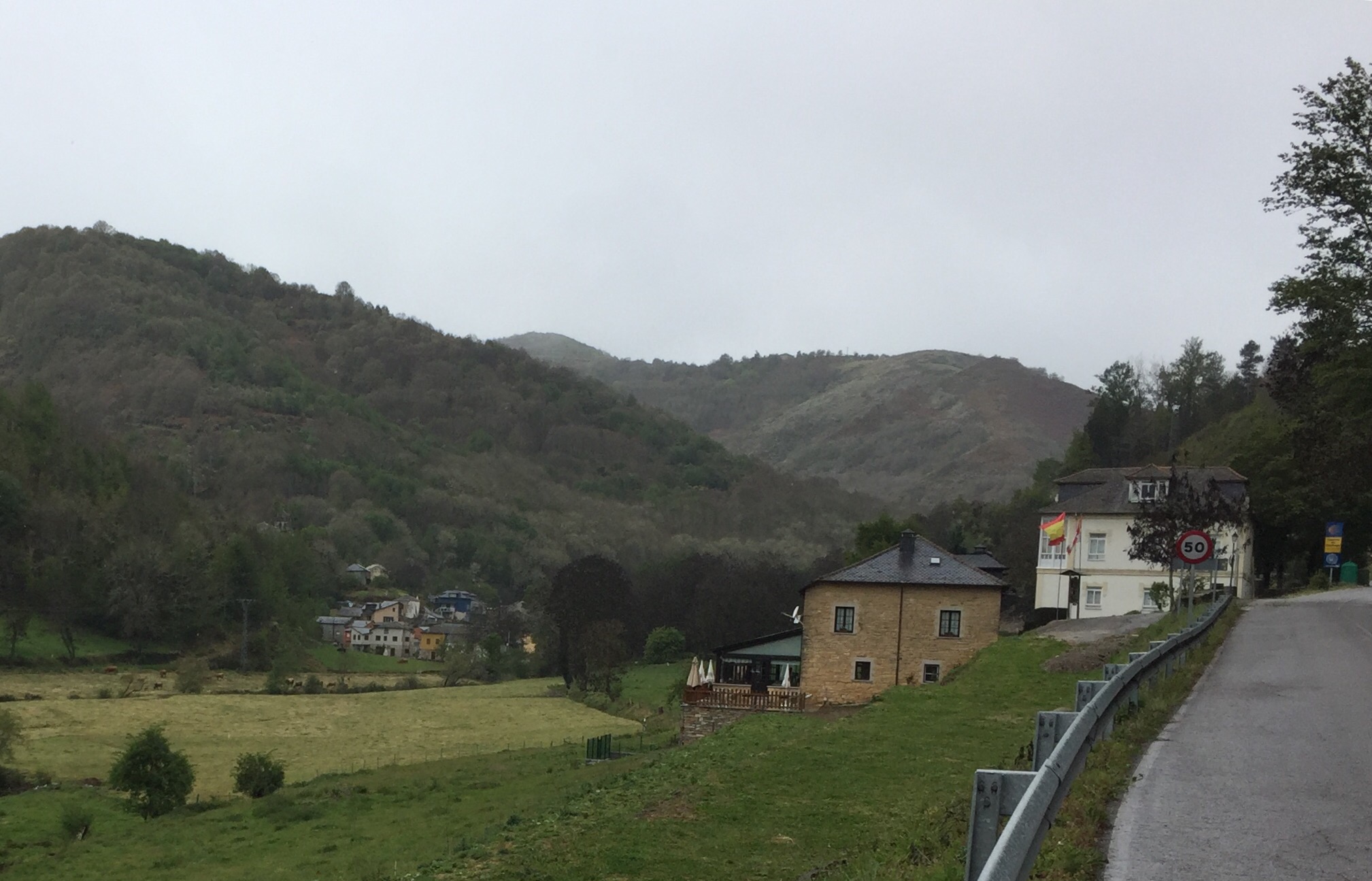 Los primeros 4 kms que llevan a Portomarin, pasando por A Pena y Mercadoiro son de bajada continuada, lo que a esas horas, con las piernas todavía frías, fueron una penalidad especial, ya que pese a haber descansado bien y dormir con las piernas en alto, el problema persiste y no va a desaparecer hasta dar un descanso durante al menos un par de días. Lo mejor era el paisaje, por la niebla que se veía al fondo.