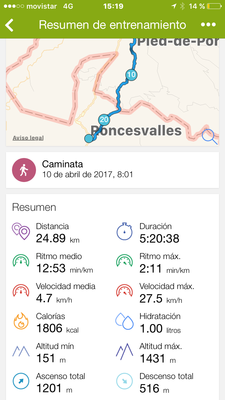 Y por lo que concierne a mis percepciones hay algo que me está sorprendiendo gratamente: desde que he empezado el Camino es la primera vez que, tras varios días de marcha, y además de etapas largas, rápidas y algunas muy duras, no tengo la menor molestia en los pies, ni en las piernas, más allá del lógico cansancio tras cada jornada, pero que se recupera de un día para otro. Ni siquiera (o tal vez por eso) estoy recurriendo a los remedios antes habituales de la vaselina, el alcohol de romero, las protecciones ínter dedos del pie ni el ibuprofeno. Me limito, en cuanto al cuidado de los pies, al gel para descanso de los ídem, que pongo cada día tras la ducha y que tenía en casa sin usar desde hace 12 años.