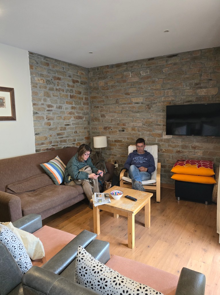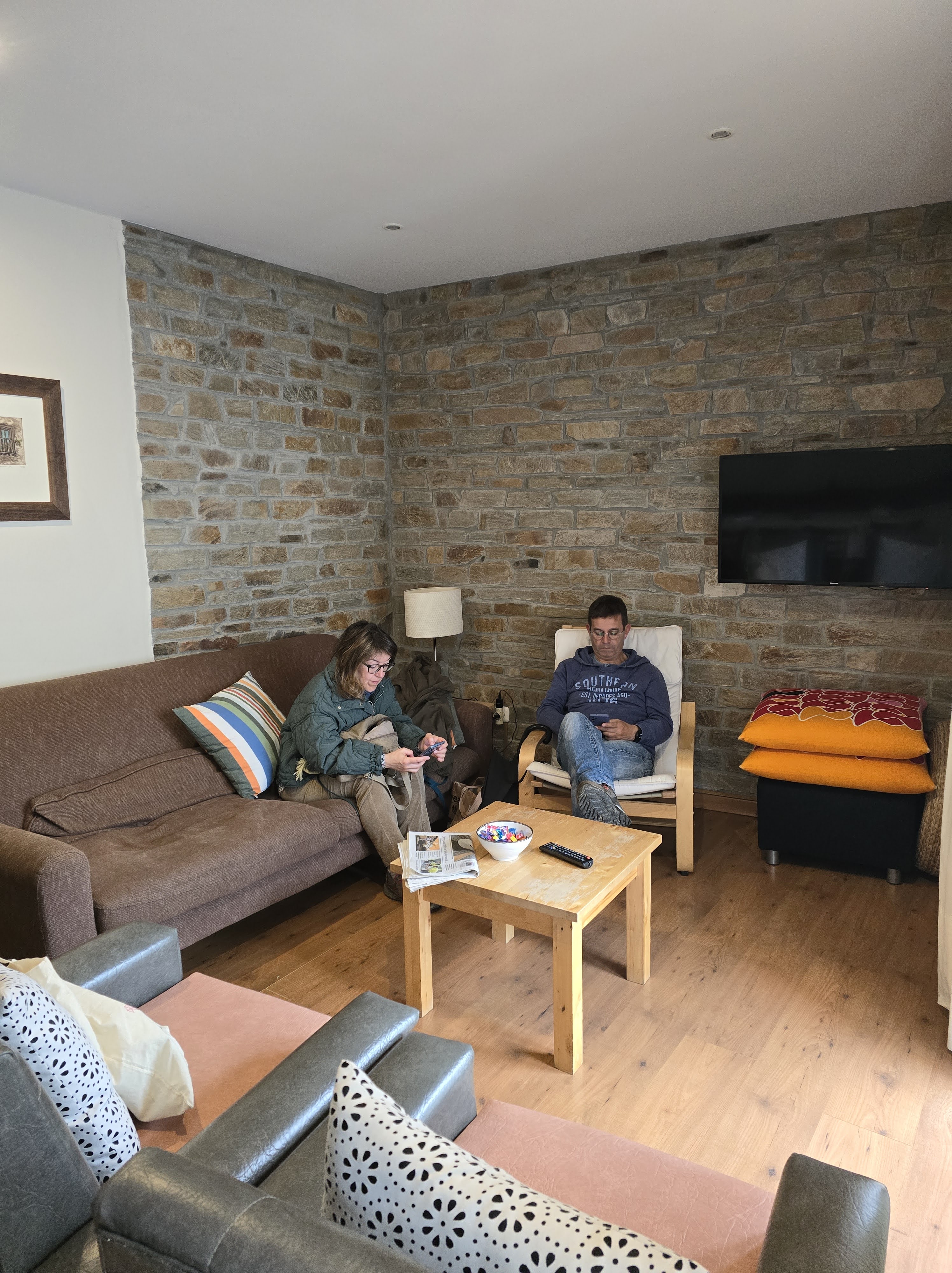 Al llegar a la Casa Rural María, en el centro de la población, pudimos acceder momentáneamente por la calle donde está ubicada para descargar maletas y todas las provisiones que llevamos para los desayunos y reuniones post-cenas, ya que nosotros ocupamos en su integridad la casa, que tiene 5 habitaciones, cada una con su baño, y un salón adecuado a las reuniones de los 10 integrantes del finde, pero que no funciona como un hotel o alojamiento donde además hay servicio de comidas.