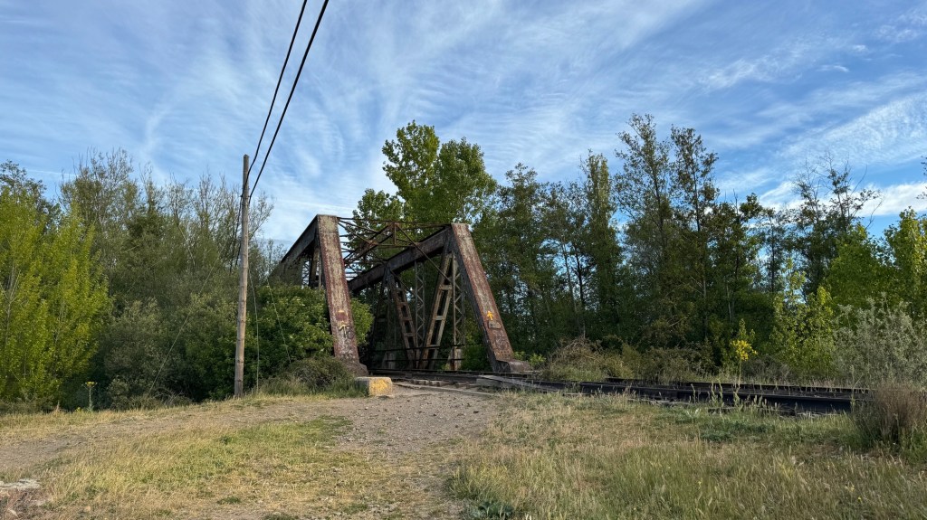 Poco después se adentra en el campo y más adelante atraviesa el río por un puente de hierro que se conserva de la antigua línea del ferrocarril.