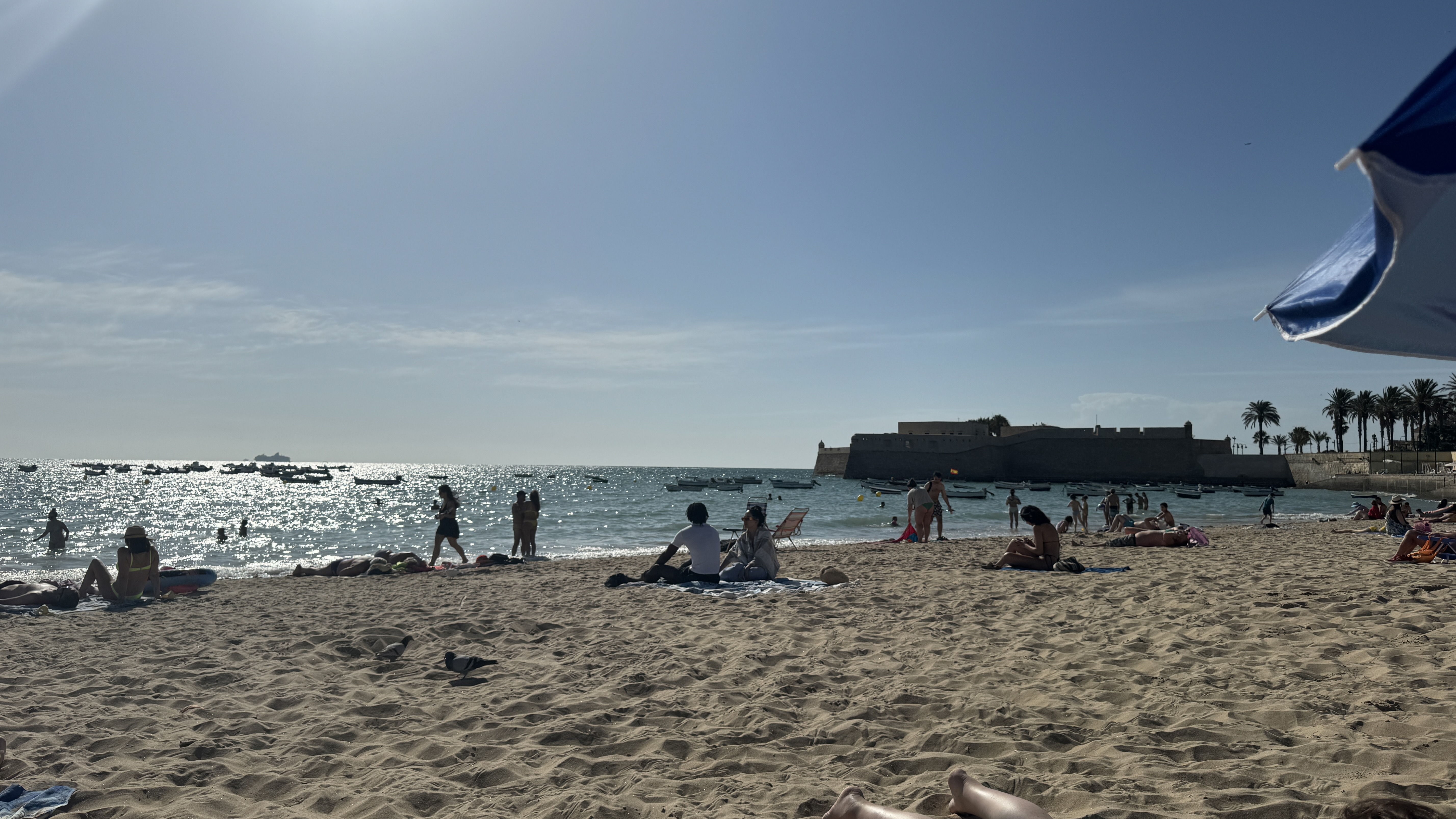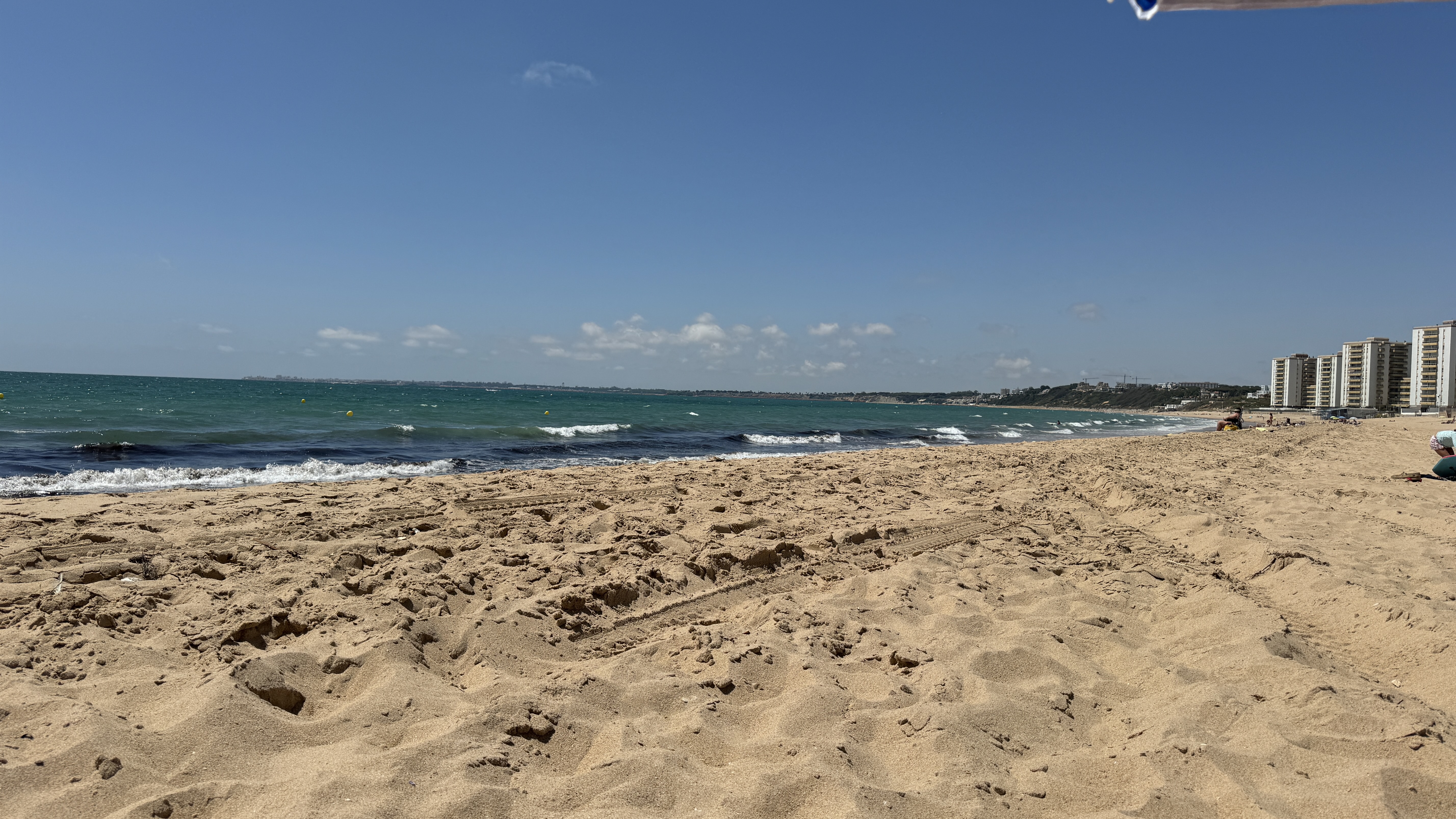 Estuvimos en la playa de El Buzo el primer día, pero había algunas algas en la zona de baño, por lo cual en esa primera fecha creo que solo yo me bañé. En una segunda ocasión fuimos a Valdelagrana, con menos oleaje y sin algas, pero tenía el inconveniente de que allí la arena es extremadamente fina, y como hacía bastante viento, la arena se nos venía encima, con lo que hubimos de cambiarnos a una parte de la playa más cercana al agua, donde la arena estaba más compacta.