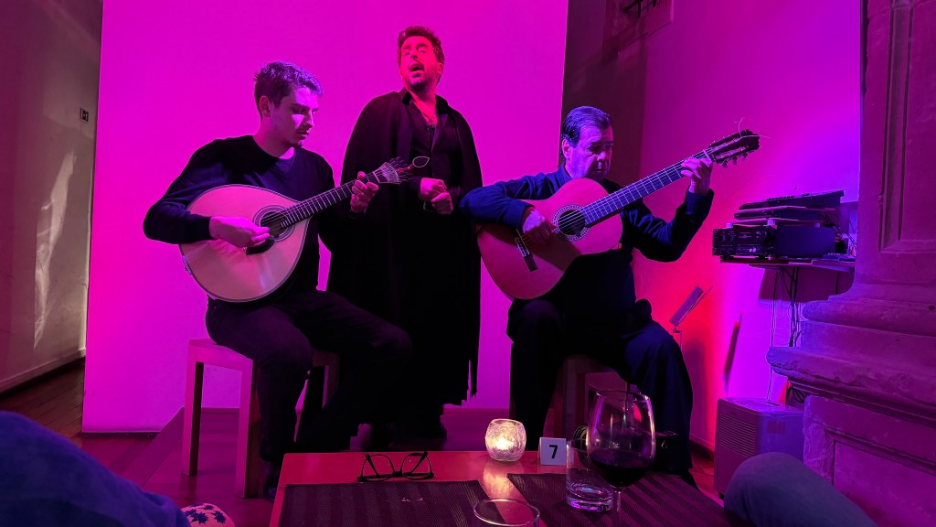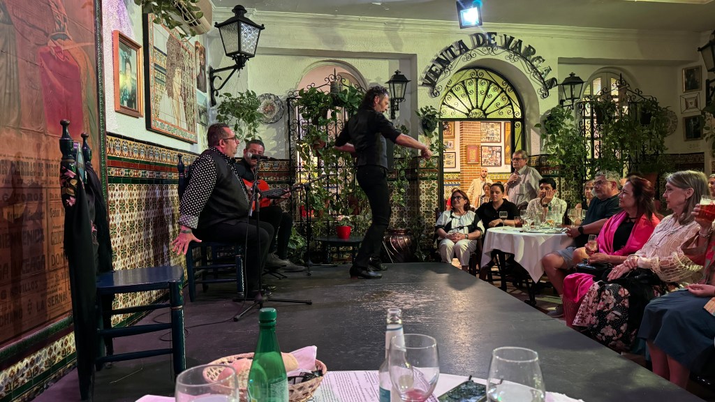 La cena no fue lo mejor de la velada, pero sí la actuación de una pareja de guitarra y cantante, con la participación de un bailaor que hizo las delicias de un numeroso grupo de «maduritas» que asistieron a la sesión. Al final, incluso el bailaor subió al escenario a parte de sus amigos y familia y nos dieron un completo recital de baile andaluz.