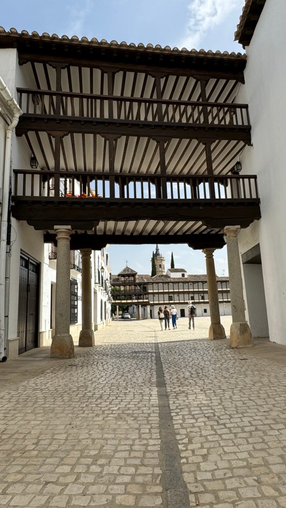 Hay que señalar que, de los poco más de 15 grados que había en nuestra ciudad, en esa parada inicial la temperatura exterior estaba en 35 grados, y pese a todo no nos dejamos agobiar por el calor y pudimos hacer un corto pero tranquilo recorrido por las calles y plazas de Tembleque, lugar en el que la Plaza Mayor merece un reconocimiento especial por sus balconadas muy bien cuidadas, el edificio de la biblioteca, y la iglesia principal. Desde luego valió la pena la parada.
