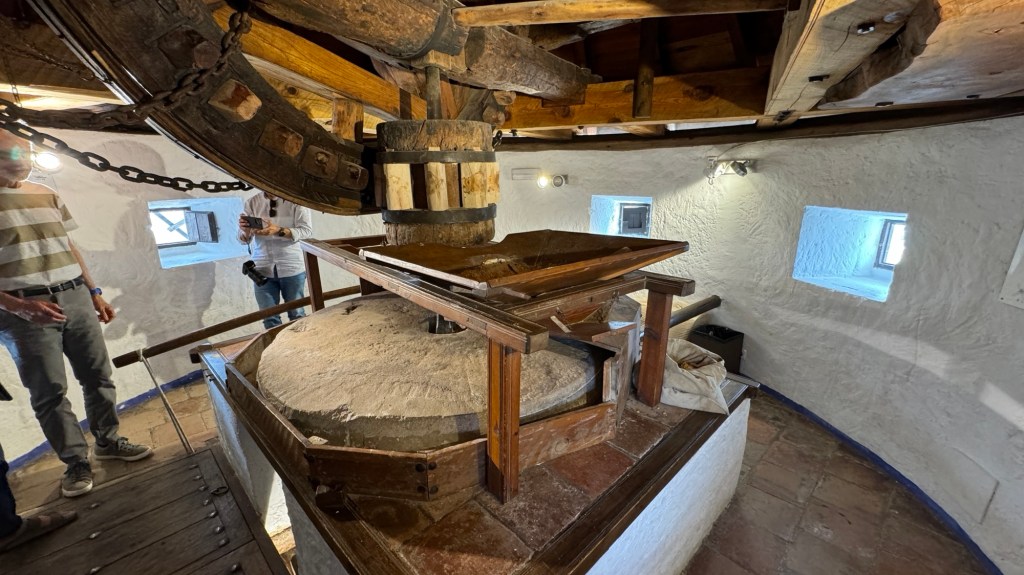 El segundo destino programado era Consuegra, la ciudad de los molinos y el castillo situado en lo alto de una loma. De los 12 molinos que se conservan, hay varios con la maquinaria original y que siguen en funcionamiento aunque solo sea para demostraciones. En nuestro caso visitamos el denominado Rucio, pudiendo acceder a lo alto del mismo y verificar la maquinaria que permite la operatividad del mismo.