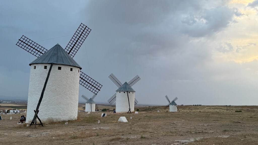 Tuvimos la ocasión de fotografiar los molinos cuando se iba a producir la puesta de sol, si bien el hecho de que estaba una tarde que amenazaba tormenta nos privó de un cielo despejado a esa hora.