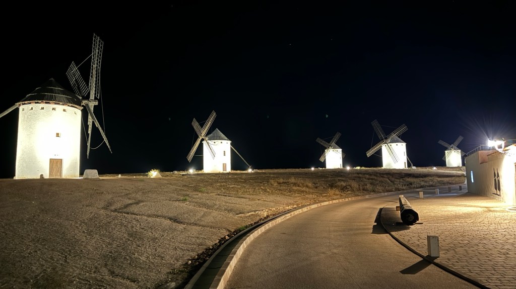 Aun así, terminada la cena, ya cerca de la medianoche, pudimos contemplar de nuevo los molinos ya iluminados.
