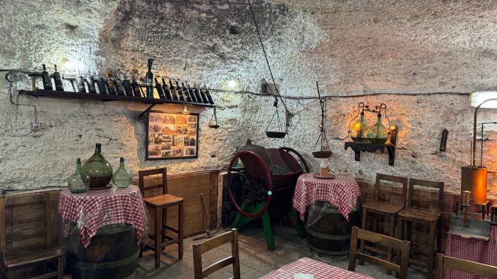 Cerca del restaurante está la Cueva Galileo en la que teníamos concertada previamente una visita. Esa cueva es una de las más de 700 que se mantienen en Tomelloso, que en su día superaron los dos millares. Al parecer el suelo de la ciudad es de piedra (tosca, en su jerga) y bajo esa piedra hay arena, que se excavaba y se hacían bodegas para guardar el vino, cuya producción en toda la zona de Valdepeñas y alrededores es enorme. Nos mostraron lo que en su día eran esas cuevas y la funcionalidad que tuvieron hasta los años 80 del siglo pasado.