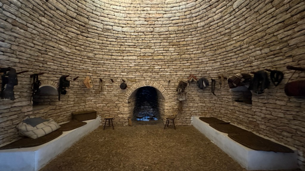 Y de allí nos fuimos al Museo del Carro y Aperos de Labranza, donde se guardan toda clase de utensilios utilizados en el campo y que se ha creado a partir de la construcción de un Bombo en 1970, que representa a las edificaciones típicas del campo manchego en las que se guardaba el grano, y todo lo necesario para trabajar en el campo.