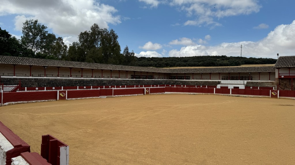 La siguiente parada fue el pueblo de Las Virtudes, que tiene la plaza de toros cuadrada más importante de España, y que además tiene anexa una capilla en la que hay un conjunto de excelentes imágenes. Ipi y yo ya habíamos estado en esa población años atrás, pero en esa oportunidad la plaza y la iglesia estaban cerradas y solo pudimos ver todo desde el exterior. Ahora visitamos con calma tanto la plaza como el interior de la iglesia, y la verdad es que valió la pena.