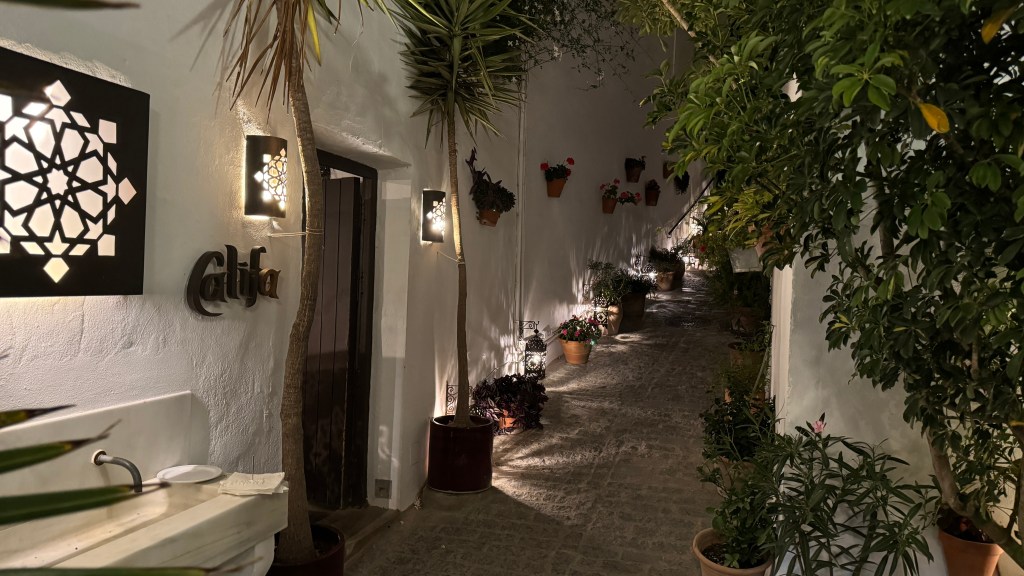 Terminada la visita guiada, en la plaza central de la villa encontramos un restaurante llamado El Jardín del Califa, en cuya terraza cenamos a base de platos «morunos». Tuvimos ocasión de ver luego el interior, con un comedor muy bien decorado. El lugar resultó ser un pequeño hotel, construido en varias alturas sobre la roca, y repleto de plantas, lo que justificaba plenamente el nombre de Jardín.
