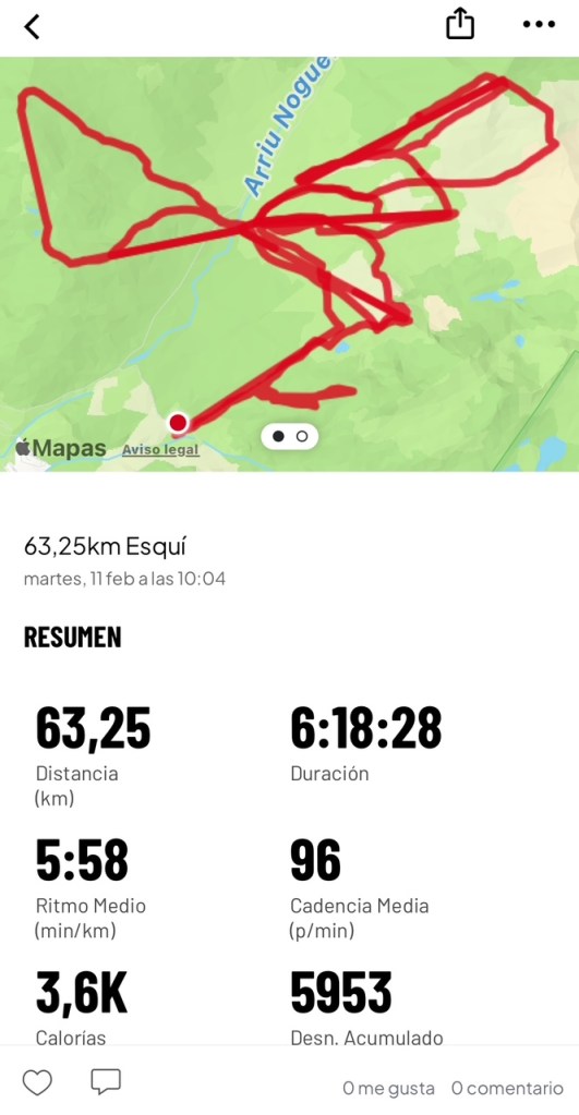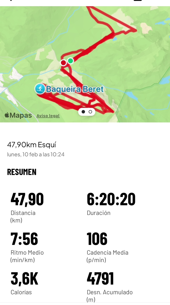 Y ya en el tramo final de nuestro recorrido diario, volvimos a subir en el TSD Dera Reina para, de camino a la base, hacer la percha que ayer ya estaba cerrada (Caumet). Asi lo hicimos, y resultó ser mucho mas alta de lo que en principio parecía, y que además tenía diversas pistas por las que salir. Optamos por la que parecía tener un recorrido más atractivo, y a la que se accede en la mitad de la bajada. Allí fuimos, aunque una vez entrado Rafa en la bajada comprobó que además de la enorme pendiente, la nieve estaba imposible. Como él ya estaba dentro, su única opción fué ir bajando casi como si fuesen escaleras, sin quitar los esquis, pero yo ya no me metí por allí y decidí seguir otra ruta, también bastante complicada, pero al menos asequible. Quedamos en volver a encontrarnos en la base del TSD Jesus Serra, pero al ver el estado final de la bajada opté por retirarme ya al coche, mientras Rafa, que se había dirigido al punto de encuentro acordado, hizo una última subida que le permitiera llegar al parking por donde lo hacemos habitualmente, con una pista en mejor estado, como asi hizo y nos encontramos para tomar el regreso al Parador. El resumen de esta segunda jornada, arroja un total de 63,25 kms recorridos, en un total de 6 h. y 18 minutos. Y un consumo de 3.600 calorías, que hay que recuperar en la cena.