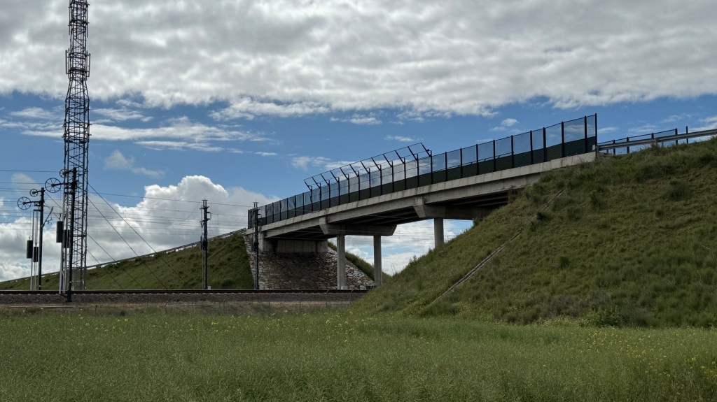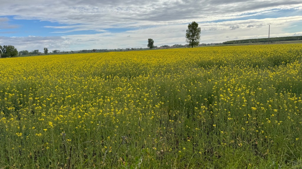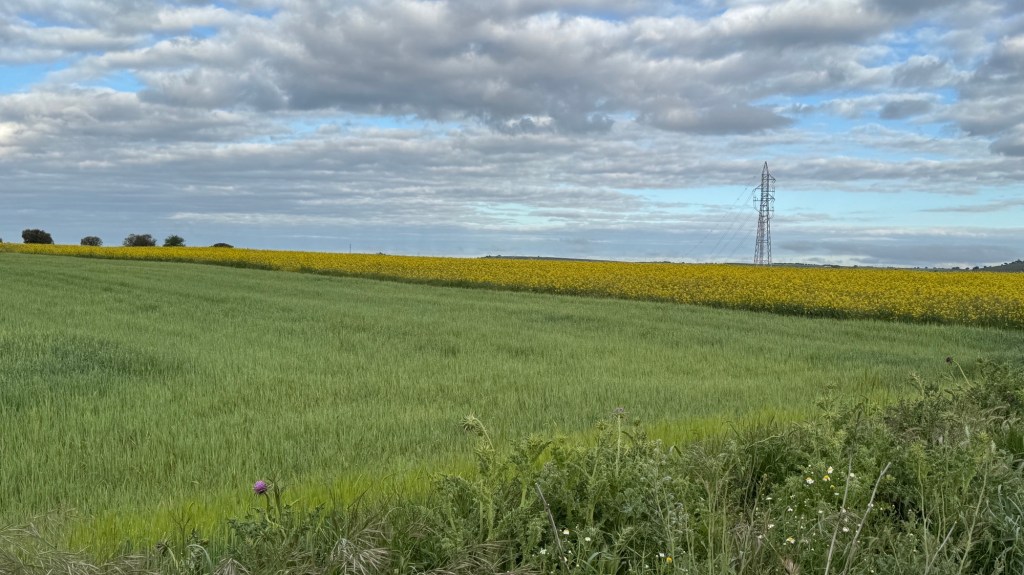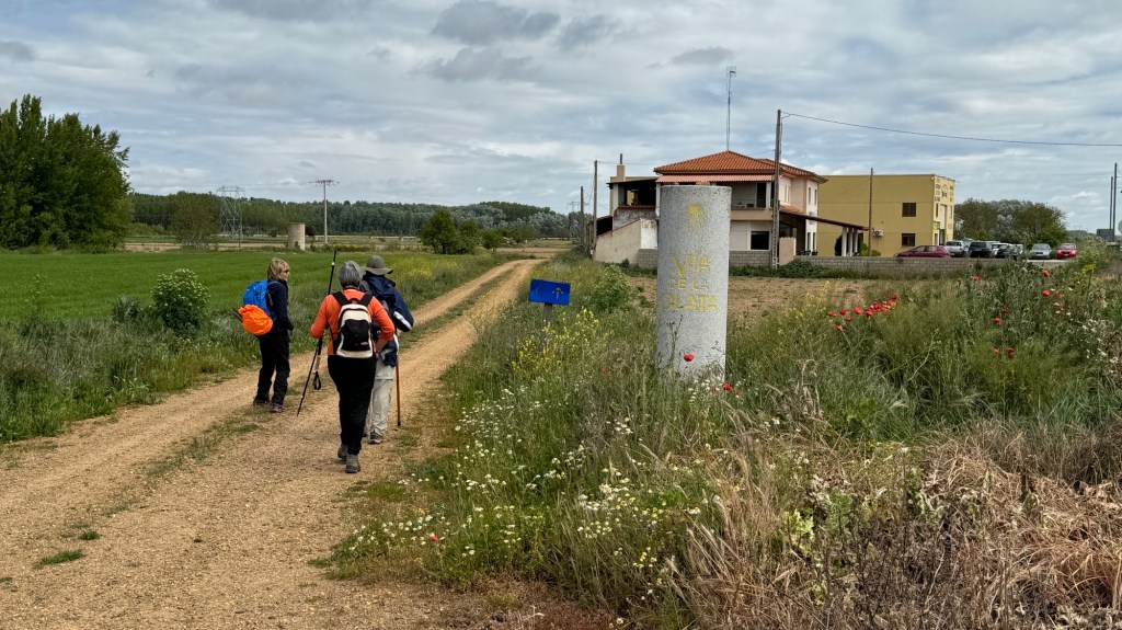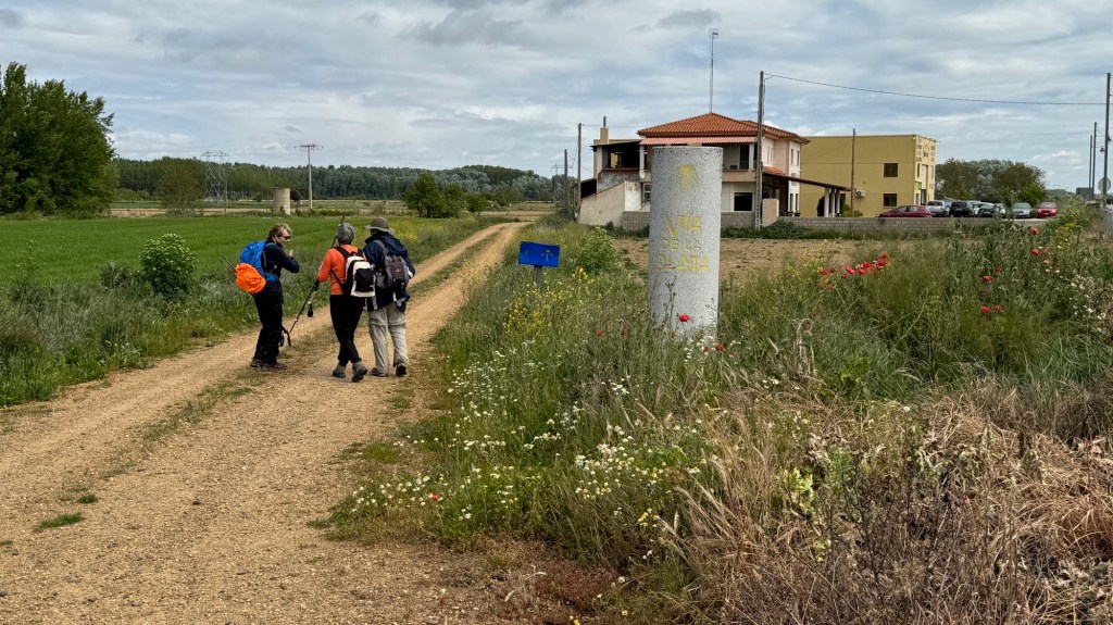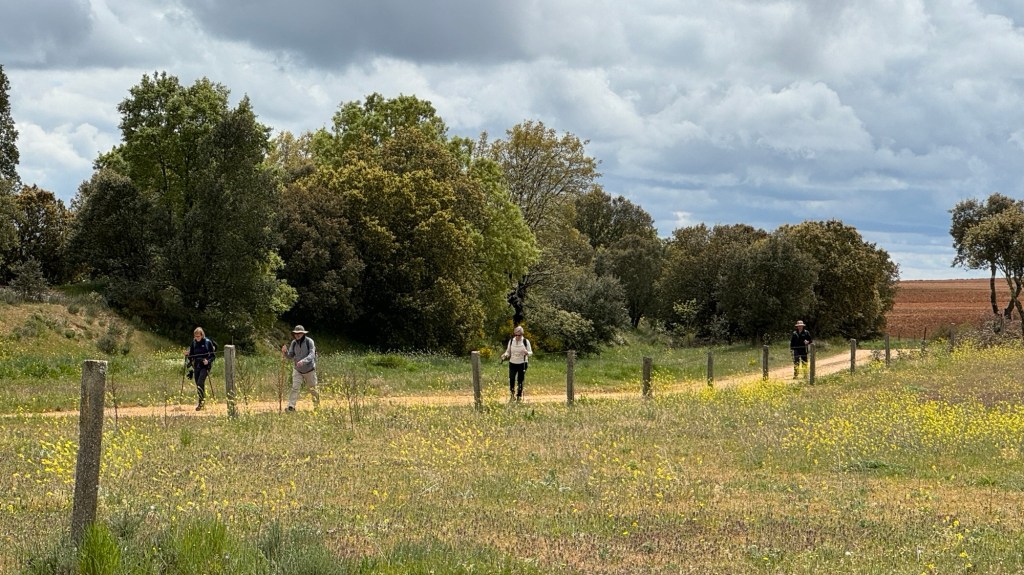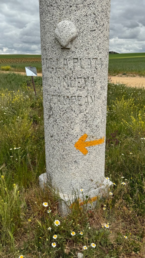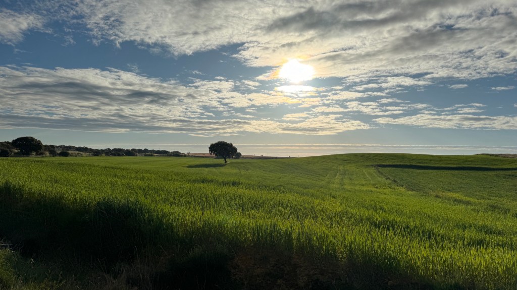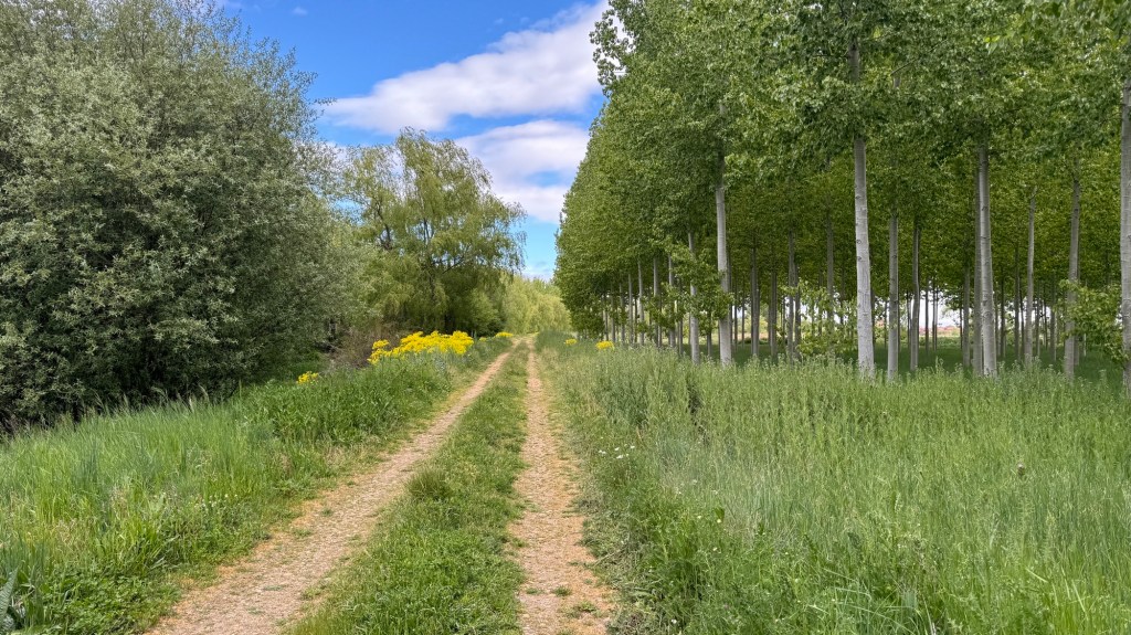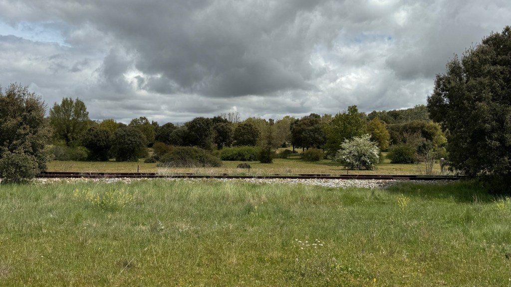 Un poco más adelante, aparece la opción de seguir por la carretera o hacerlo por caminos y decidimos seguir por el campo. Per hete ahí que al cabo de algo más de 1 km, el camino se termina sin más explicaciones y después de revisar la información de Gronze decidimos continuar campo a través hasta volver a encontrar ruta señalizada. Es de reseñar que en estas dos últimas jornadas, las señales son escasas o brillan por su ausencia.