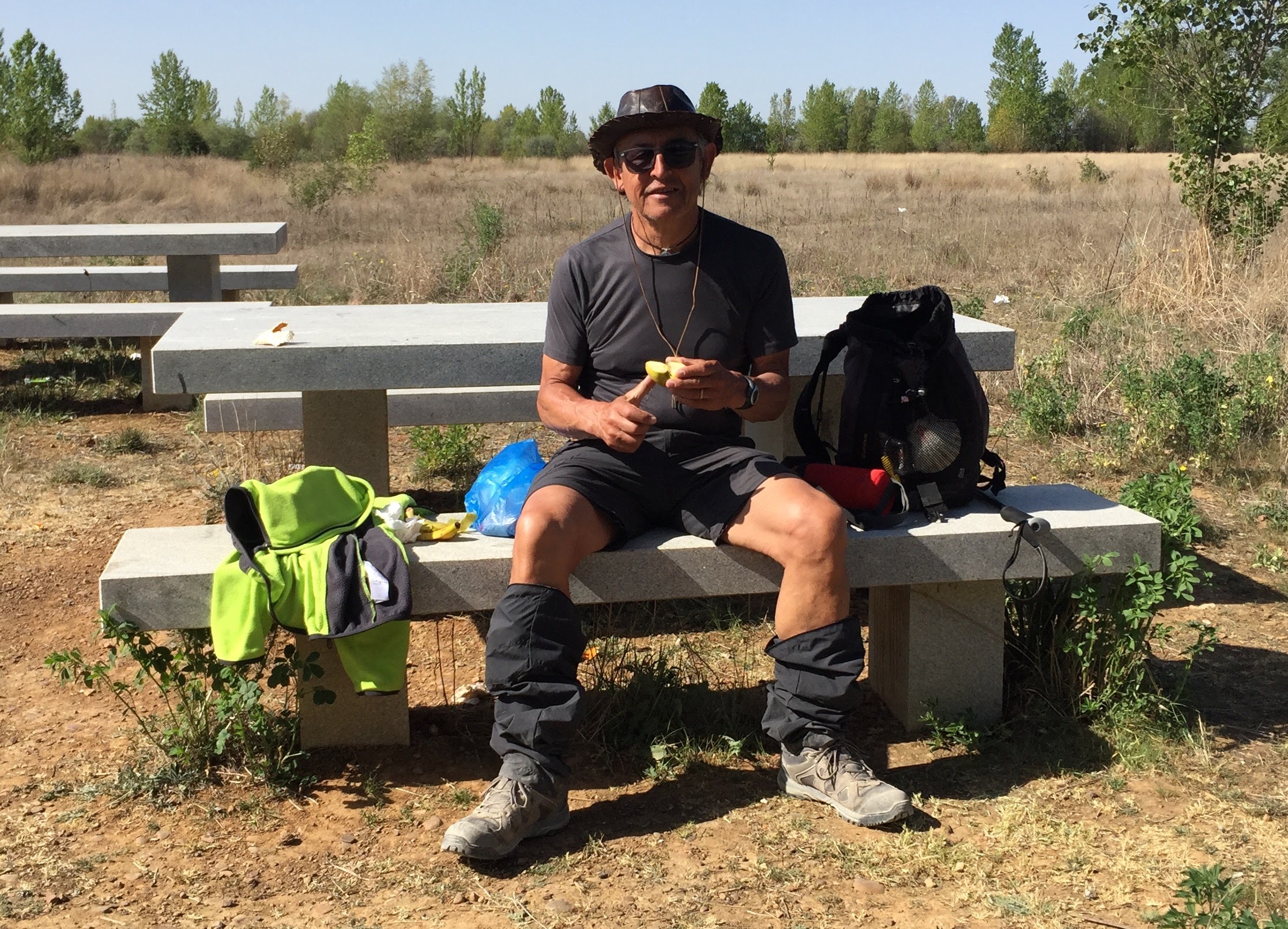 Finalmente conseguimos localizar algunas señales y llegar al pueblo siguiente, Santa Elena de Jamuz. A la salida del lugar, después de decidir que entre seguir por la carretera o meternos al interior, acordamos ir por senderos. Pero antes hacemos una corta parada campestre para tomar fruta, frutos secos e incluso alguno un poco de queso.