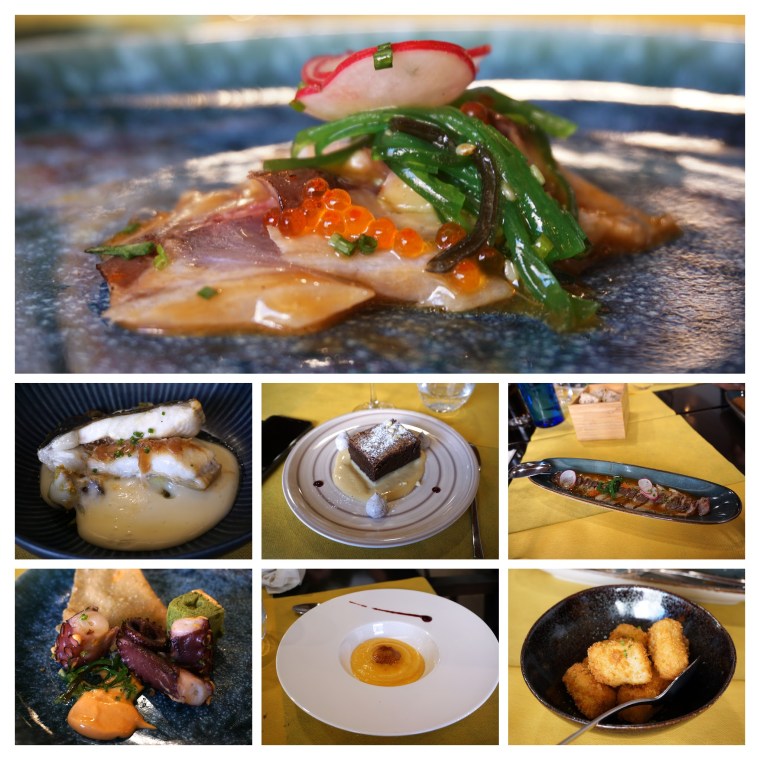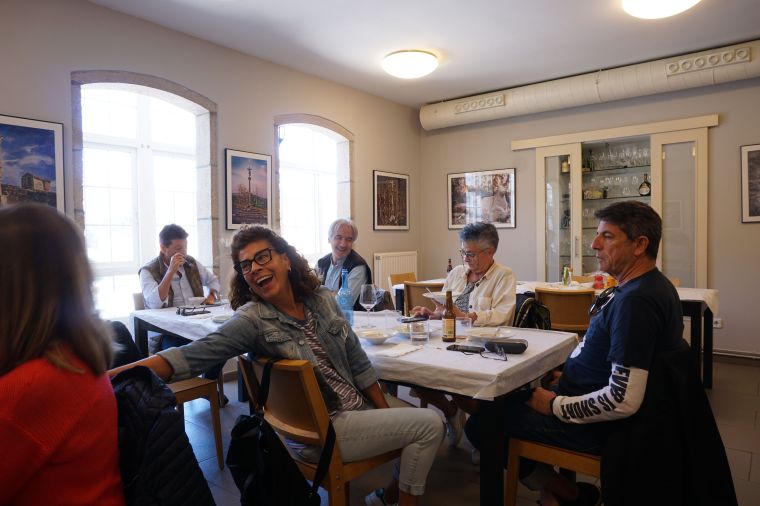 Tras esas visitas volvimos a los coches para dirigirnos a Pontevedra, donde teníamos reservada la comida en el Restaurante Bocarte, desconocido para todos, pero del que habíamos tenido buena información a través de Tripadvisor. Inicialmente intentamos reservar en Eirado da Leña, lugar ya conocido por algunos de nosotros y con excelentes recuerdos, pero no era posible la reserva para un grupo tan numeroso. No obstante, la elección final fué un completo éxito para todos los viajeros, tanto en lo referente al menú como por el trato recibido, la amplitud de las instalaciones y el conjunto de la comida. El menú estaba compuesto de unos entrantes (Tataki de jurel con pimientos confitados, Mihojas de pulpo con verduras y algas y Croquetas artesanas), a lo que siguió un Lomo de Rodaballo confitado con verduras y patata tierna, y rematado todo ello al postre conun Brownie de chocolate tibio con salsa de vainilla. Regado todo con vinos albariño y rioja. En fin, una espléndida comida que nos dejó a todos con ganas de repetir en una futura visita a la ciudad.