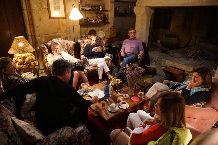 La cena se llevó a cabo en un amplio comedor, con chimenea, que compartimos con otras dos mesas de otros grupos de comensales. Para esa finalidad se adecuaba perfectamente, pero en cambio a efectos de la sobremesa hubiese sido más adecuado otro tipo de salón, y si bien en alguna de las zonas de la casa había otros salones, pero no estaban acondicionados para acomodarnos los 16 miembros de la expedición. En cualquier caso la cena resultó amena y todavía tras la misma tuvimos tiempo de charlar animadamente hasta que los más dormilones comenzaron a irse a sus habitaciones, camino que poco después tomamos el resto de los más golfos. El menú estuvo bien. Se componía de unos entrantes (croquetas, embutidos, champiñones, revuelto de setas), y como plato fuerte, Costilla de cerdo con ensalada y patatas fritas; también pusieron unos langostinos a la plancha para quienes no comían carne. Y después del postre y cafés, chupitos. A la mañana siguiente, un desayuno a base de tostadas, bizcocho y zumo, acompañando al cola-cao, o café, según los casos.