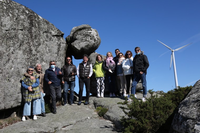 Nuevamente en los coches abandonamos el Pazo, no sin ganas de retornar en otra ocasión ya sea en primavera o verano, y desde allí nos dirigimos a la Serra do Cando, para subir al Miradoiro das Tres Rias, que está en lo alto del monte, donde soplaba un viento increible que justifica la existencia de un gran parque eólico, y desde cuyo mirador se pueden observar las rias de Vigo (con el puente de Rande), de Pontevedra, y de Arosa. Aunque se ven muy a lo lejos, se definen claramente. Allí aprovechamos también para constatar gráficamente la visita, que nos costó bastante debido a que la carretera de acceso es muy estrecha y que en los últimos 5 kms se convierte en poco mas que un sendero de tierra y grava, en el que los coches en ocasiones rozaban los bajos. Pero como todos los asistentes son buenos conductores llegamos a la cima sin más problemas que la lentitud de la marcha en algunos momentos. Tras el mirador, a poco más de un kilómetro está otro punto a señalar, la Porta do Alén (puerta del más allá), a donde nos acercamos para realizar el paso hacia el futuro, hacia otro mundo, aunque todos terminamos regresando al nuestro donde pese a todo nos va bien.