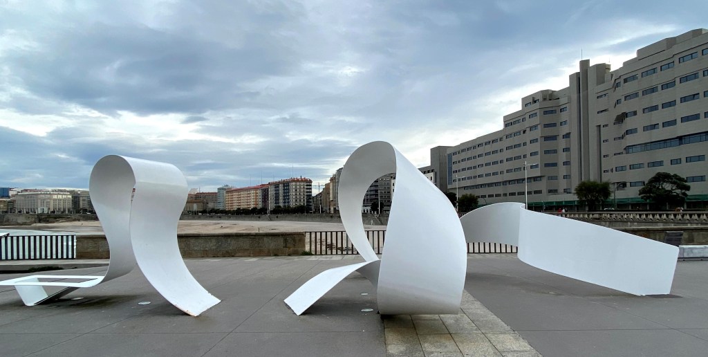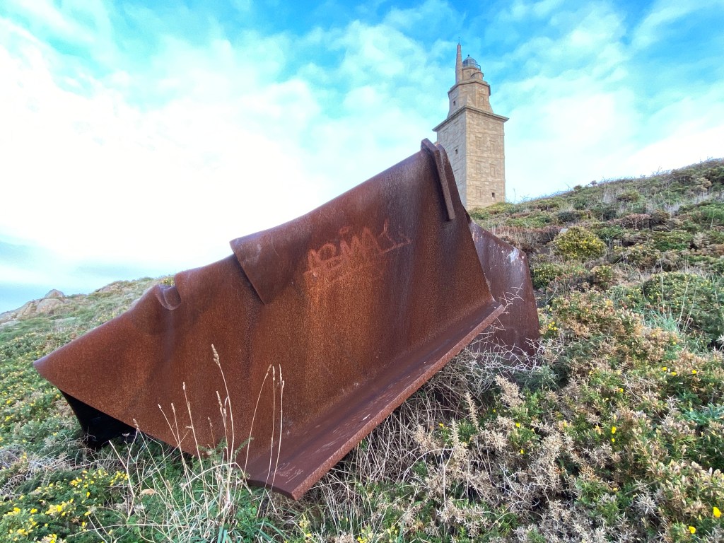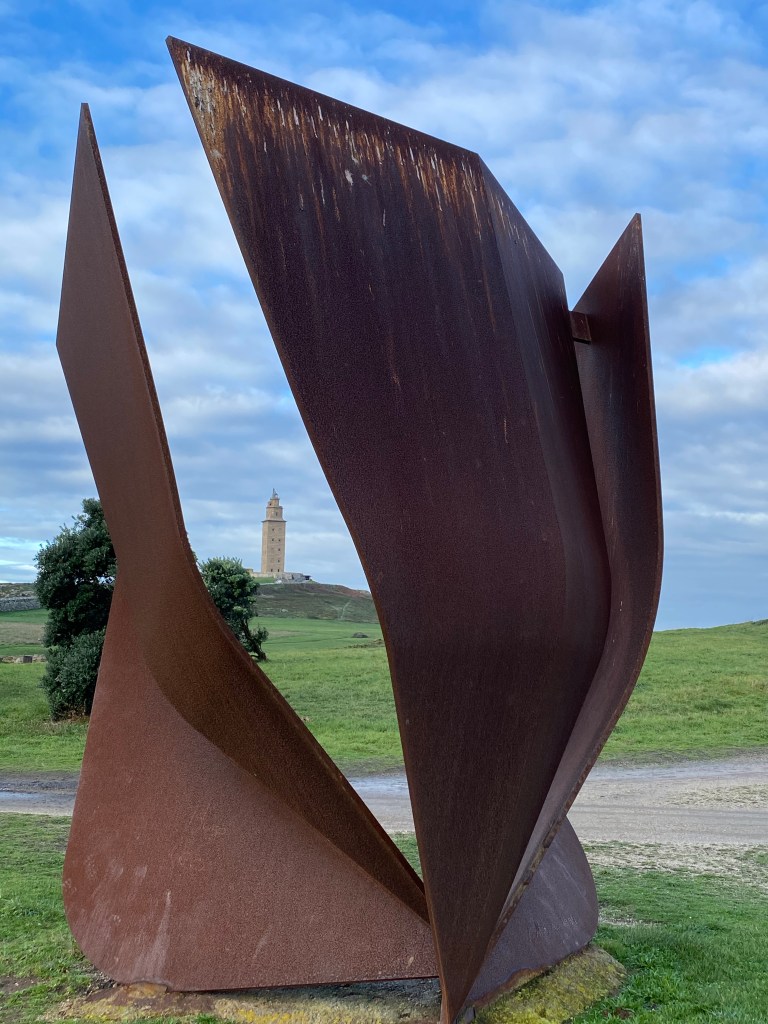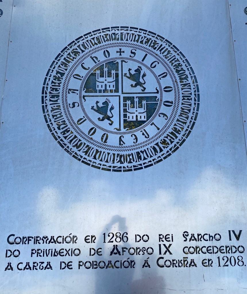 A la altura, mas o menos, de la vía que se aparta del paseo marítimo para acceder al Acuario, nos encontramos a la derecha con una rotonda que aloja una escultura-monumento que no sé exactamente qué representa pero que, vista según se camina, ofrece una interesante perspectiva junto a la Torre como fondo. Y un poco más adelante, a la derecha, un monumento que conmemora la confirmación por el rey Sancho IV en el año 1286 del privilegio de Alfonso IX otorgando en el 1208 a A Coruña la carta de Población, equivalente a lo que sería el título de ciudad.