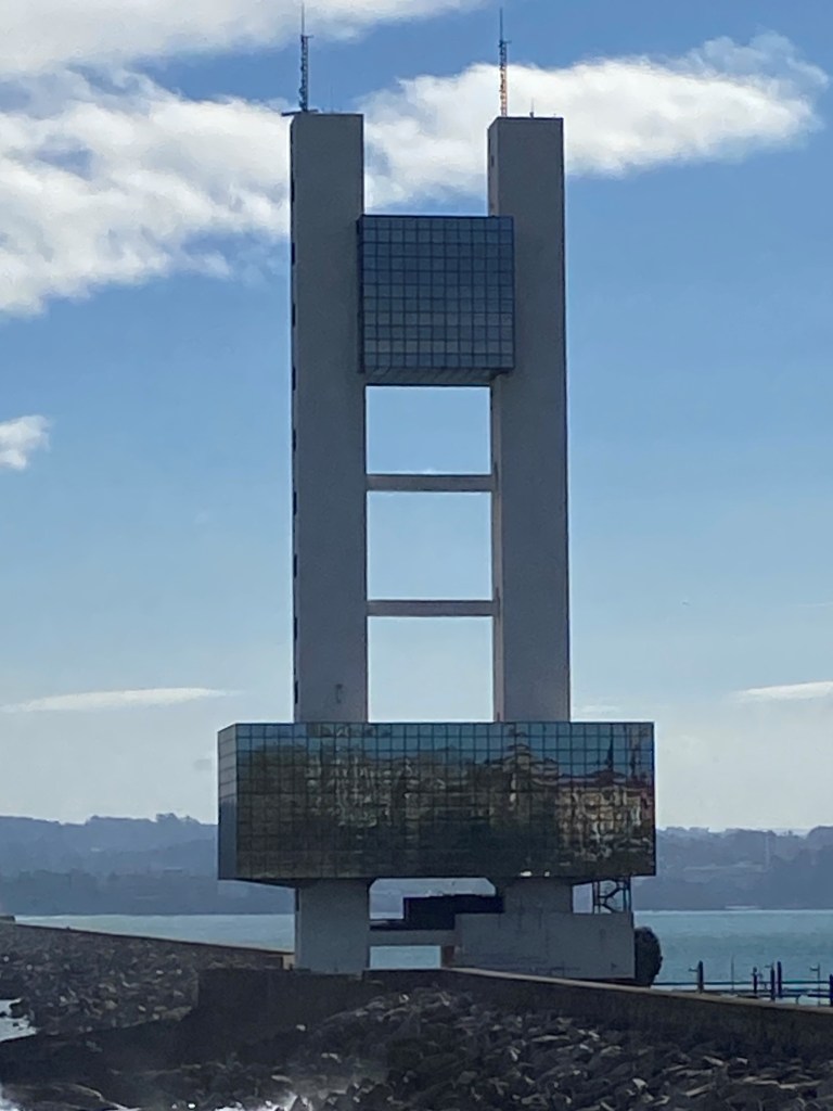 Y a continuación, seguimos caminando hacia el dique de abrigo, dejando a la derecha el complejo de la Universidad, antiguo cuartel hoy reformado y rehabilitado, desde donde se divisa y destaca perfectamente a lo lejos la torre de control de Tráfico Marítimo, en cuya estructura intermedia se reflejan en un dia normal las construcciones ubicadas frente a ella, entre otros el Oceanográfico.